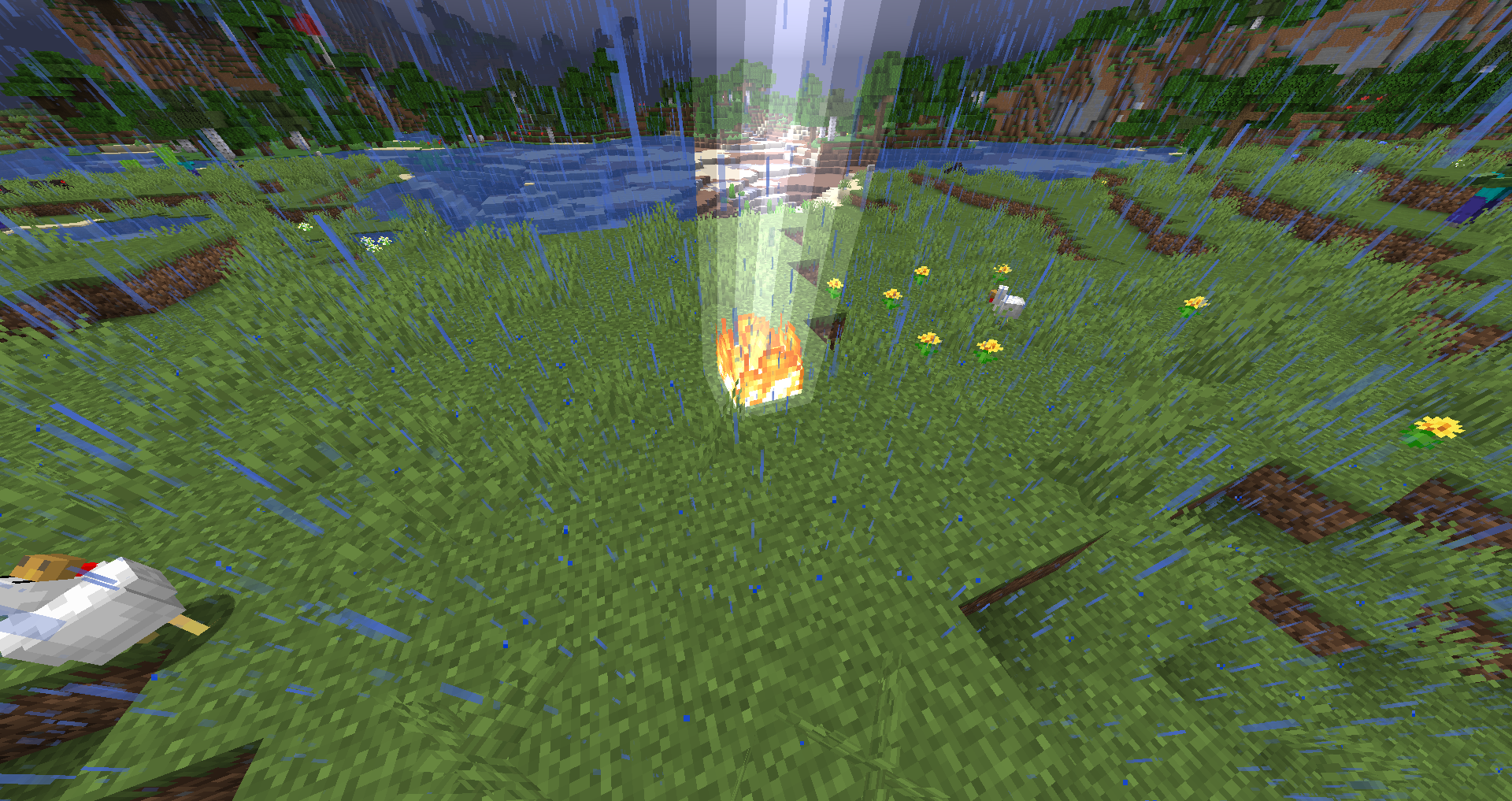 Lightning strikes randomly and creates fires (only on normal and hard difficulty) in a 2 block radius where it strikes. Such fires act normally, igniting all flammable materials, detonating TNT, and even activating nether portals. The lightning itself, however, is not destructive and does not destroy blocks. While most fires are extinguished by the rain, areas that block rain can allow the fire to spread, and any netherrack, magma blocks, soul sand, or soul soil lit by lightning is not extinguished by the rain.