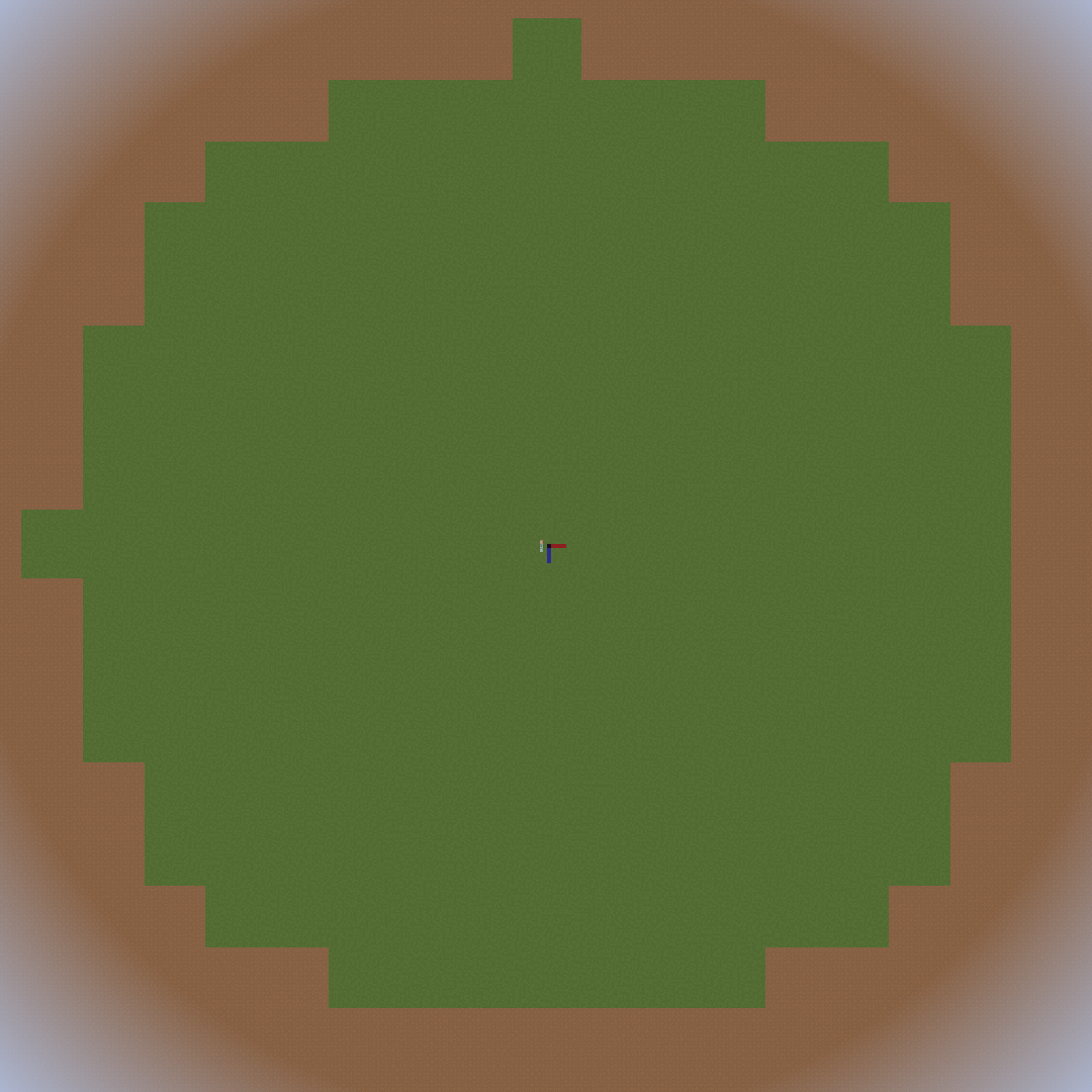 The extent of random tick, shown with the spread of grass on dirt. Notice how the grass follows chunk boundaries. The red and blue arrows in the center mark the +X and +Z directions. The player is in the (7,7) location in a chunk, slightly towards the north-west corner of the chunk, which means the centers of two chunks on the edge in the -X and -Z directions are brought within the 128-block radius, thereby allowing chunk tick processing. This is confirmed by the two one-chunk grass protrusions on the northern and western edges. (North is up)