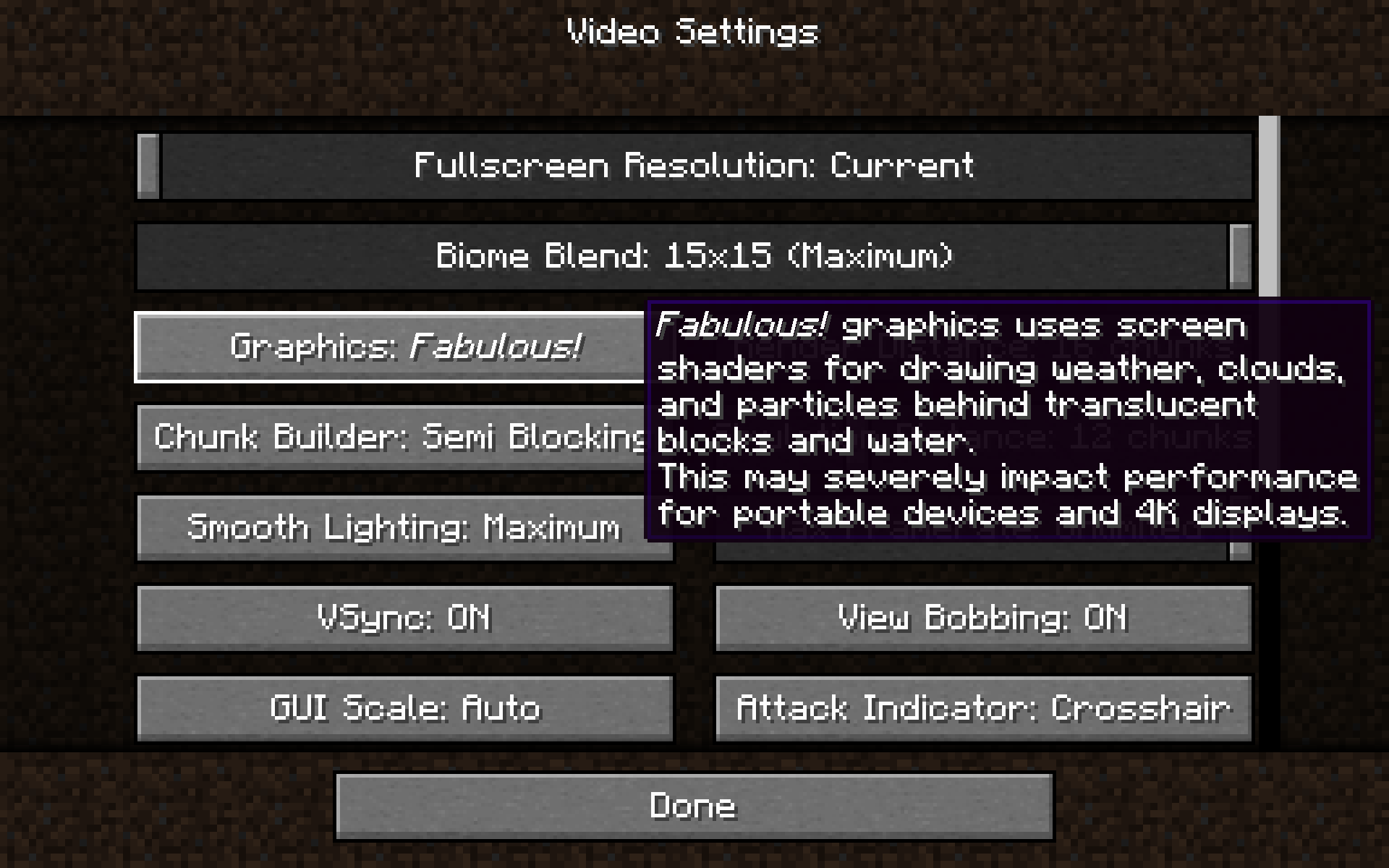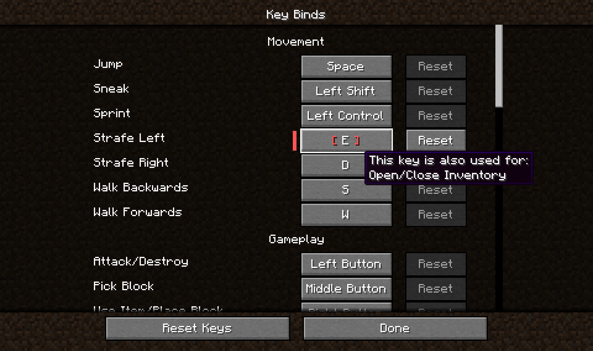 When certain buttons, text fields, and sliders are hovered over or focused on when navigating with Tab ↹, they show a description in the form of a tooltip. [Java Edition only] The “Key Binds” options menu also has tooltips to provide details on conflicts between keys. [Java Edition only]
