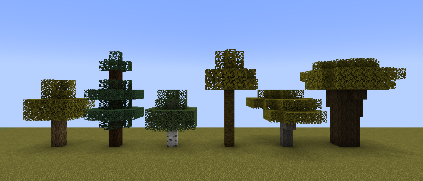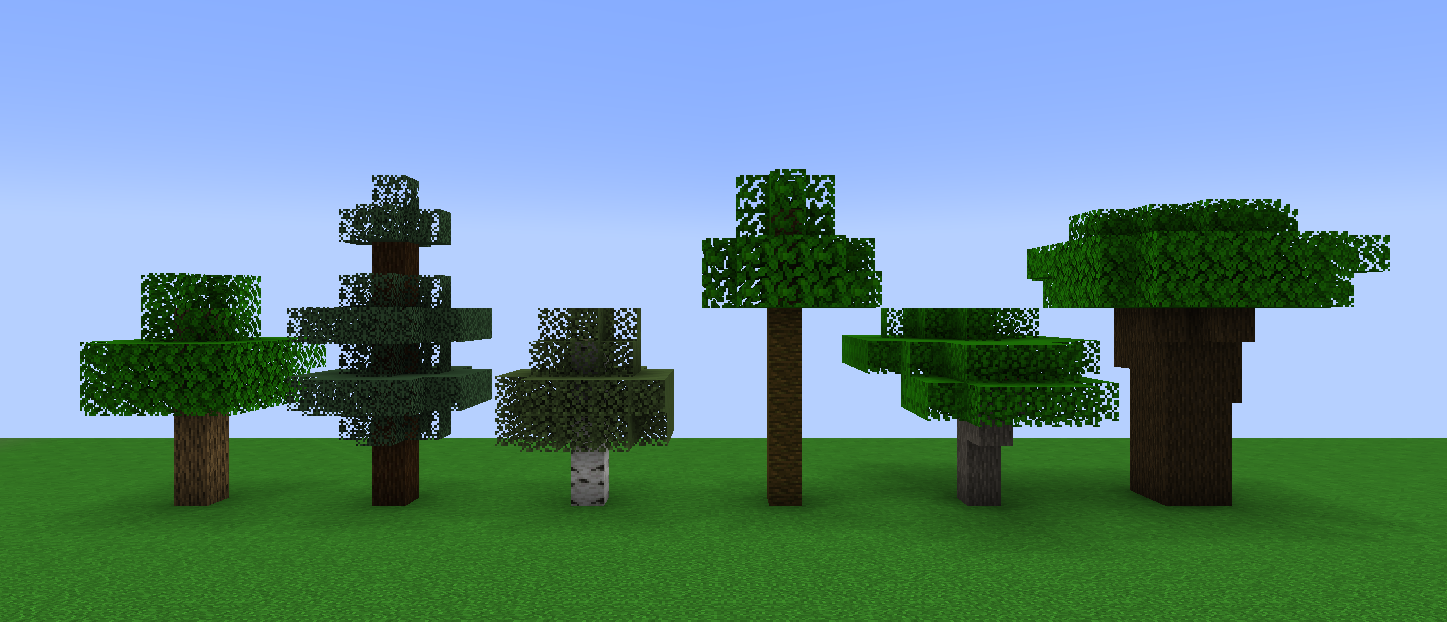 The trees found in Minecraft, excluding the jungle bush, azalea trees, mangroves, and cherry trees.