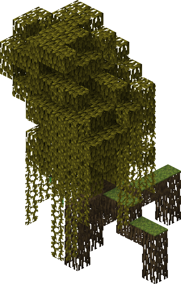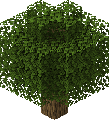 These trees have the standard growth pattern of any other tree, however, all exposed logs in the main trunk are covered with vines. They can generate as dark oak, jungle, spruce, small oak trees or be grown from saplings.