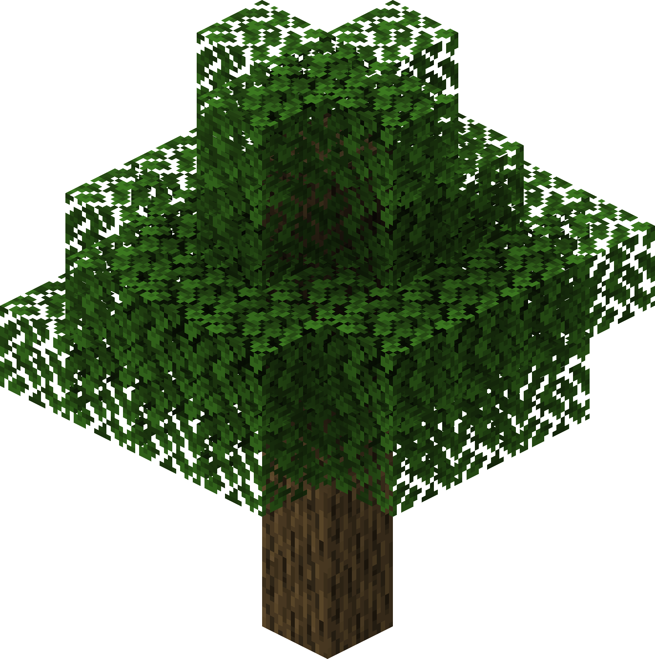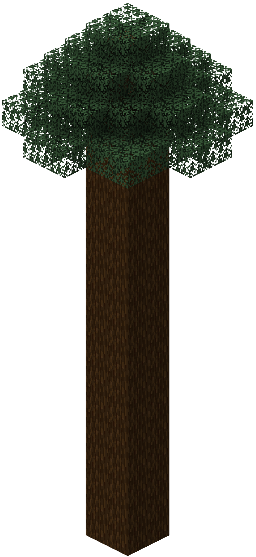 Spruce trees grow from spruce saplings and have growth patterns and requirements similar to birch trees, although they appear different. They are mainly found in the taiga biome, but they may also generate in windswept forest, snowy plains, snowy taiga, and old growth taiga biomes. Spruce logs have the same texture as oak logs, but it is a darker shade of brown; its leaves are denser, with a darker and more bluish tone.