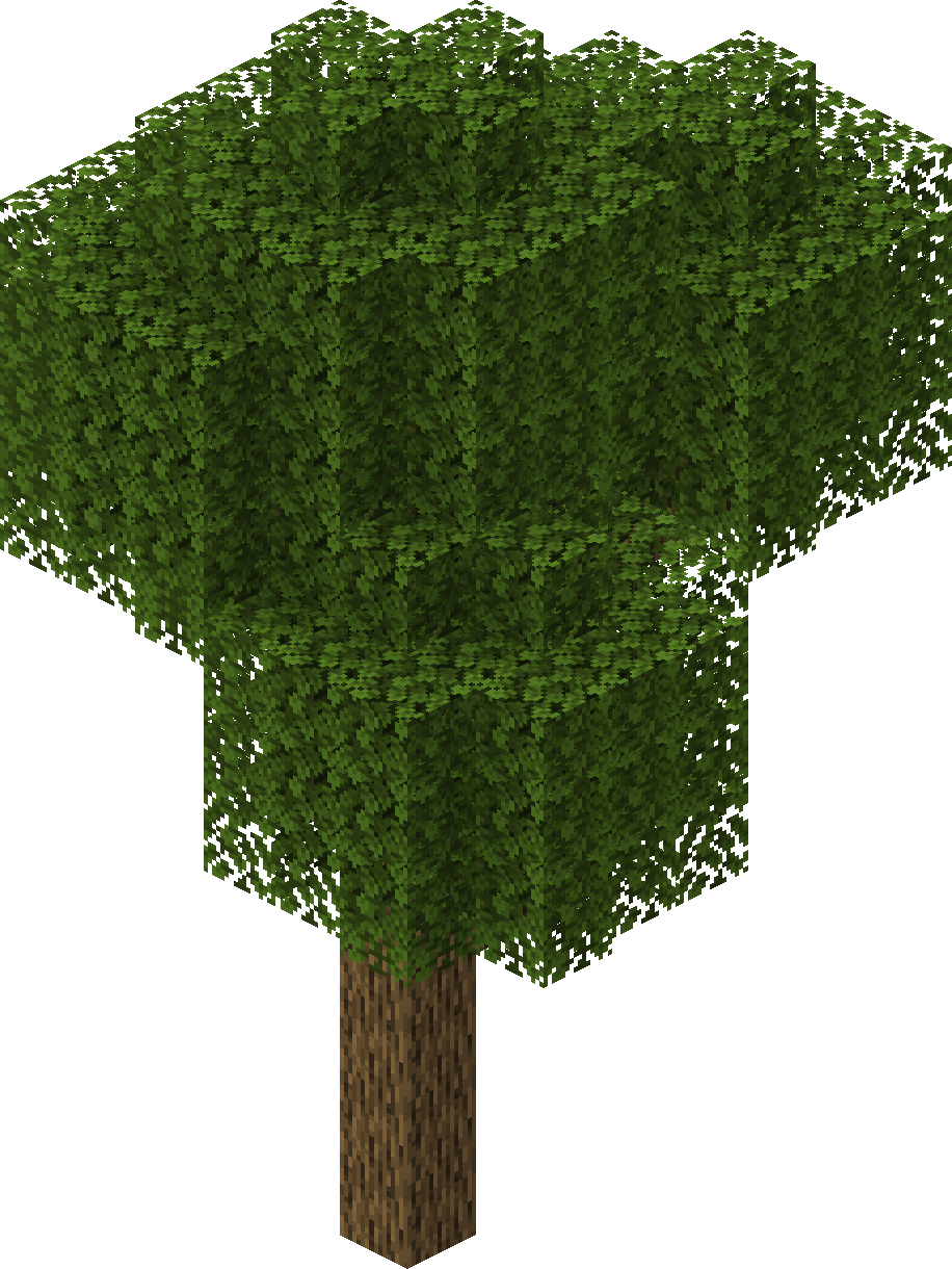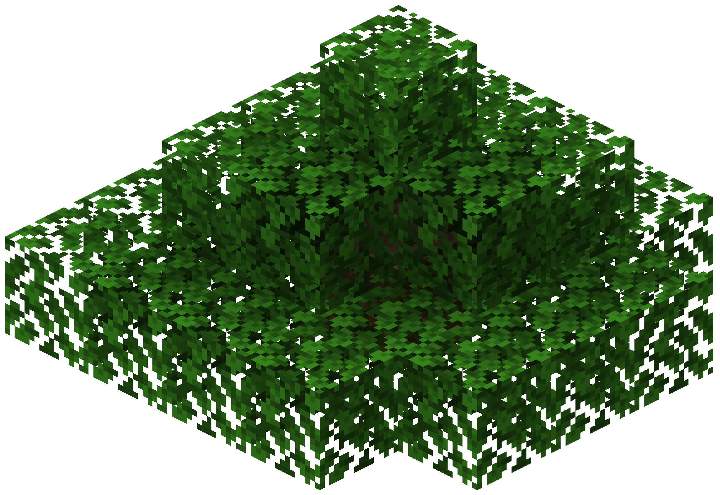 In order to grow a 2×2 tree (be it spruce, jungle or dark oak), four saplings must be placed adjacent to each other in a square. For growth to succeed, there must be no blocks adjacent (even diagonally) to the north-western side up to the final height of the tree. The bone meal can be used on any of the saplings. The largest mega jungle trees, mega spruces, and mega pines reach 31 blocks tall. Dark oaks are typically 6–8 blocks tall.