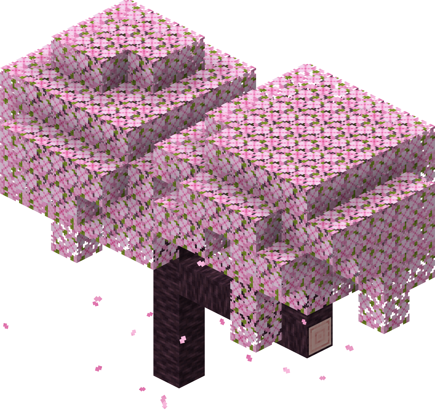 Cherry trees are found in cherry groves. They have distinct pink leaves and curved branches. They also have a unique petal falling particle effect.