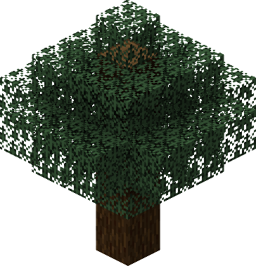 Dark oaks are found in the dark forest biome. They have thick 2×2 trunks. A dark oak always generates with dirt blocks under its trunk, even on a steep cliff. Irregular logs, representing large branches, are nearly always present and connected to the trunk. The canopy of a dark oak filters enough light that a dense forest of them is sufficiently dark for hostile mobs to spawn during the daytime.