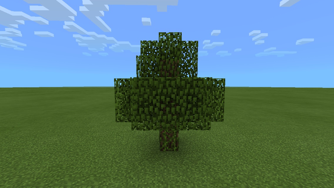 Tree canopies are composed of leaf blocks and grow 1 block higher than the highest log block (except those of the fancy oak, whose leaves grow 3 blocks higher). The canopy may begin from the ground and go up to 6 blocks from the ground. Tree canopies are generated from roughly spherical clusters of leaves about 5–7 blocks across, centered on sections of trunk or branches. Leaves must be supported by an adjacent trunk (or leaf blocks connected to the trunk); otherwise, they disappear.