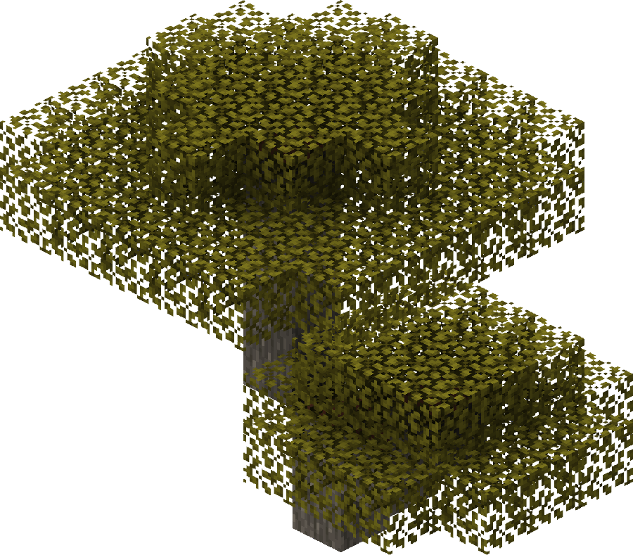 Acacias are found in the savanna biome. They are about 8 blocks tall and feature unique diagonal trunks, and may occasionally have multiple canopies.