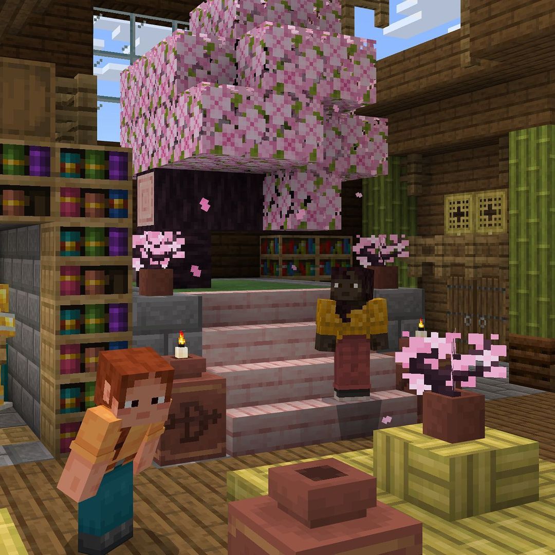 Cherry trees are found in cherry groves. They have distinct pink leaves and curved branches. They also have a unique petal falling particle effect.