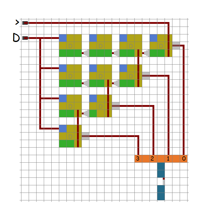 This is a device which sorts the inputs, putting 1s at the bottom and 0s at the top, in effect counting how many 1s and how many 0s there are. It is designed so that it is easily expandable, as shown in the diagram. The 5×5 center square is tileable. The inputs are at the bottom and right and the outputs are at the top and left