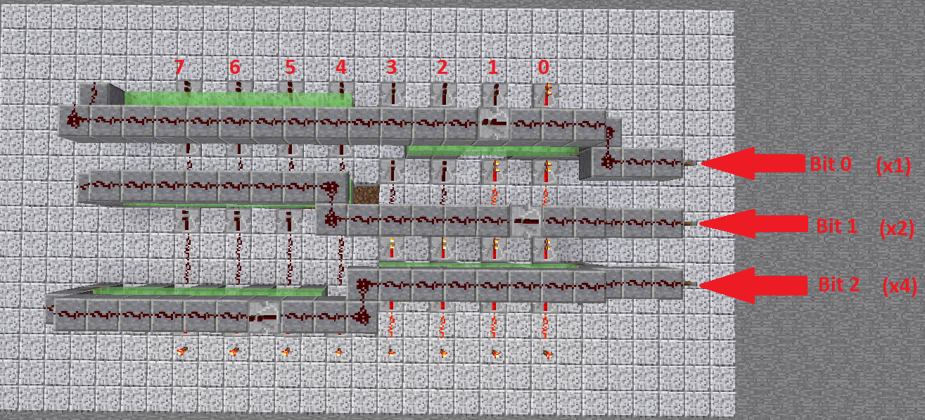 You can use this in reverse as well (not as a multiplexer, but if you reverse the repeaters the signal from every ex-outptut (0–7) will only propagate if it matches the current state of the demultiplexer, so it works like "Output3 = (Input3) AND (Demux=011)").