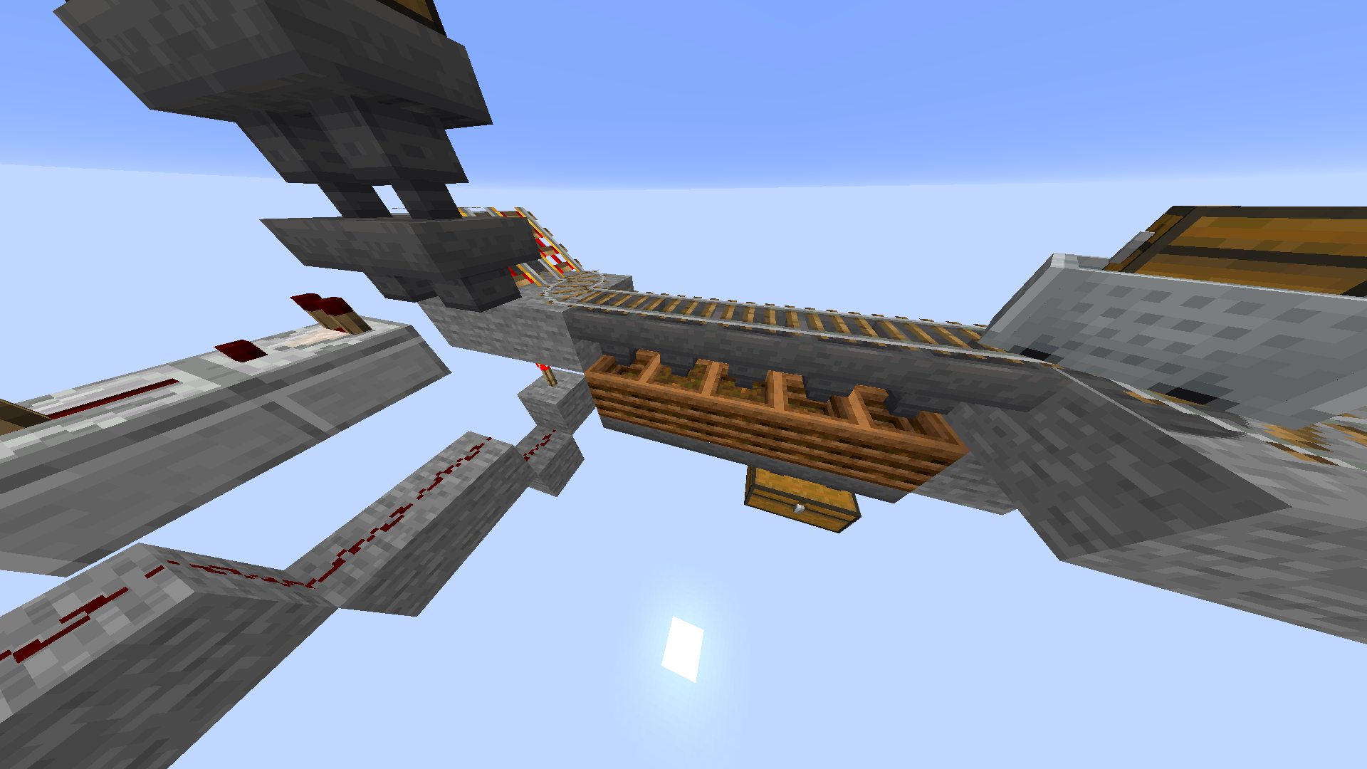 Items can be inserted into the composter by placing a hopper on top of a composter. The farm starts by adding unwanted compostable items into the chest on the top left (see picture). The items in the chest occasionally drop into a minecart with a hopper that travels along a track over the hoppers above the composters. The items are taken out of the hopper minecart and into the composter which automatically gets composted. When the composter is fully fertilised the bone meal is taken into the bottom chests.