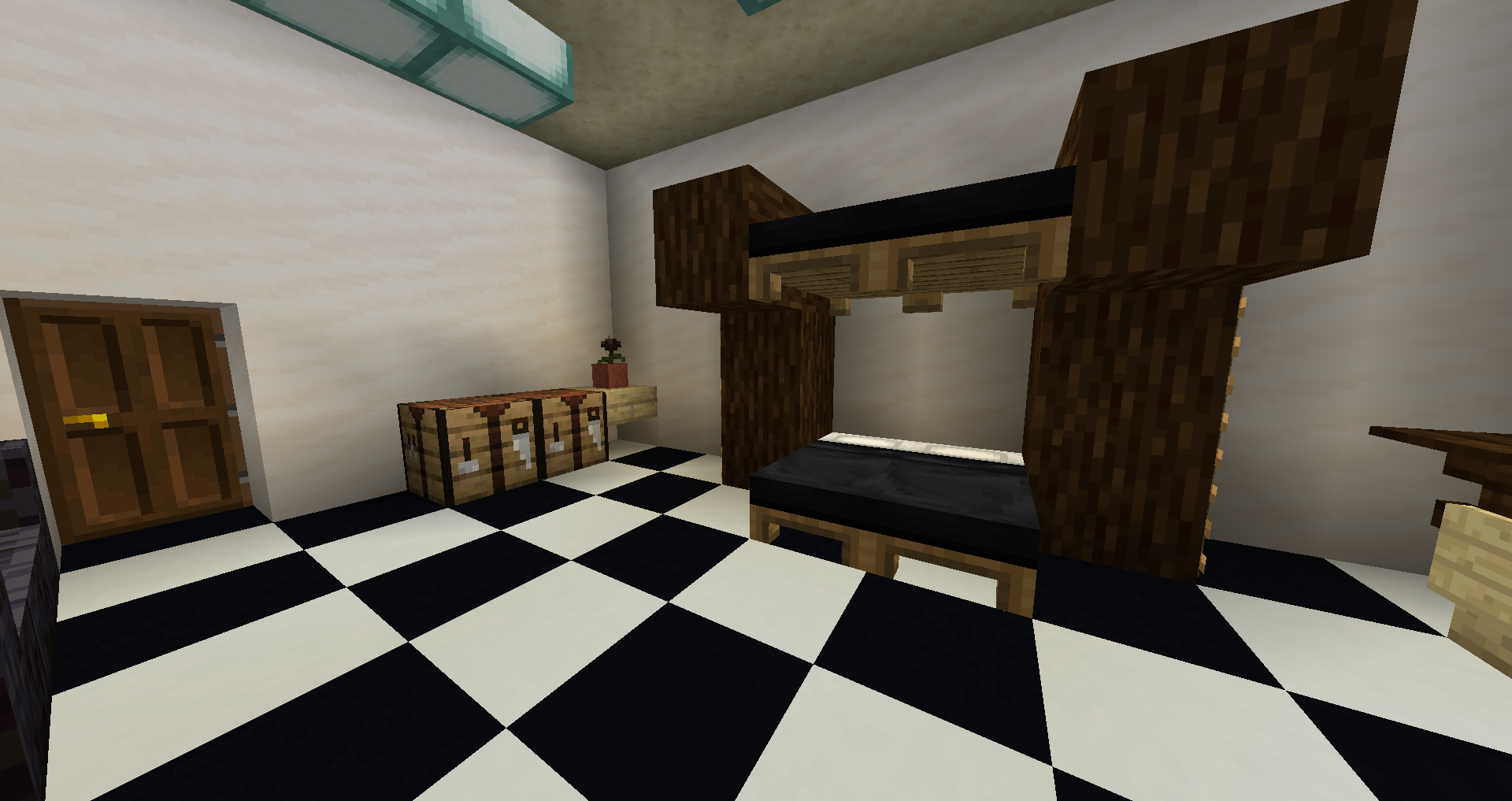 A modern house is mainly used in the richer parts of cities, or you could make small ones for main homes (takes a long time!) make them out of lighter materials, and add dashes of color if necessary. The floor looks awesome with cyan wool or cyan carpet and be sure to add mini floors! (Mini floors are stories of a modern home that are up near the ceiling and have glass panes for fences.) Add smaller rooms off of the bigger ones.