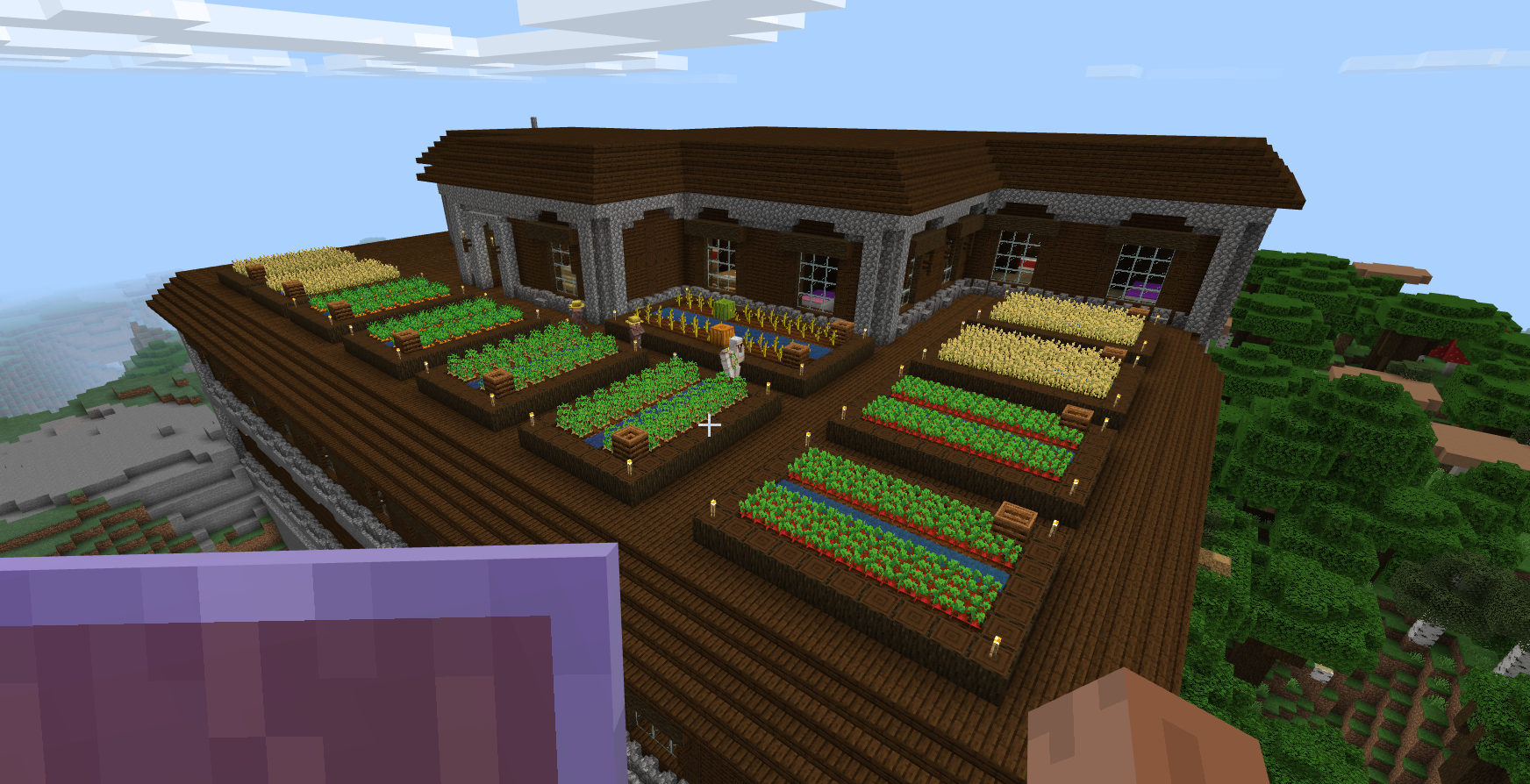 A Woodland Mansion turned into a base with farms on the rooftop. A few villagers and an iron golem is visible from here.