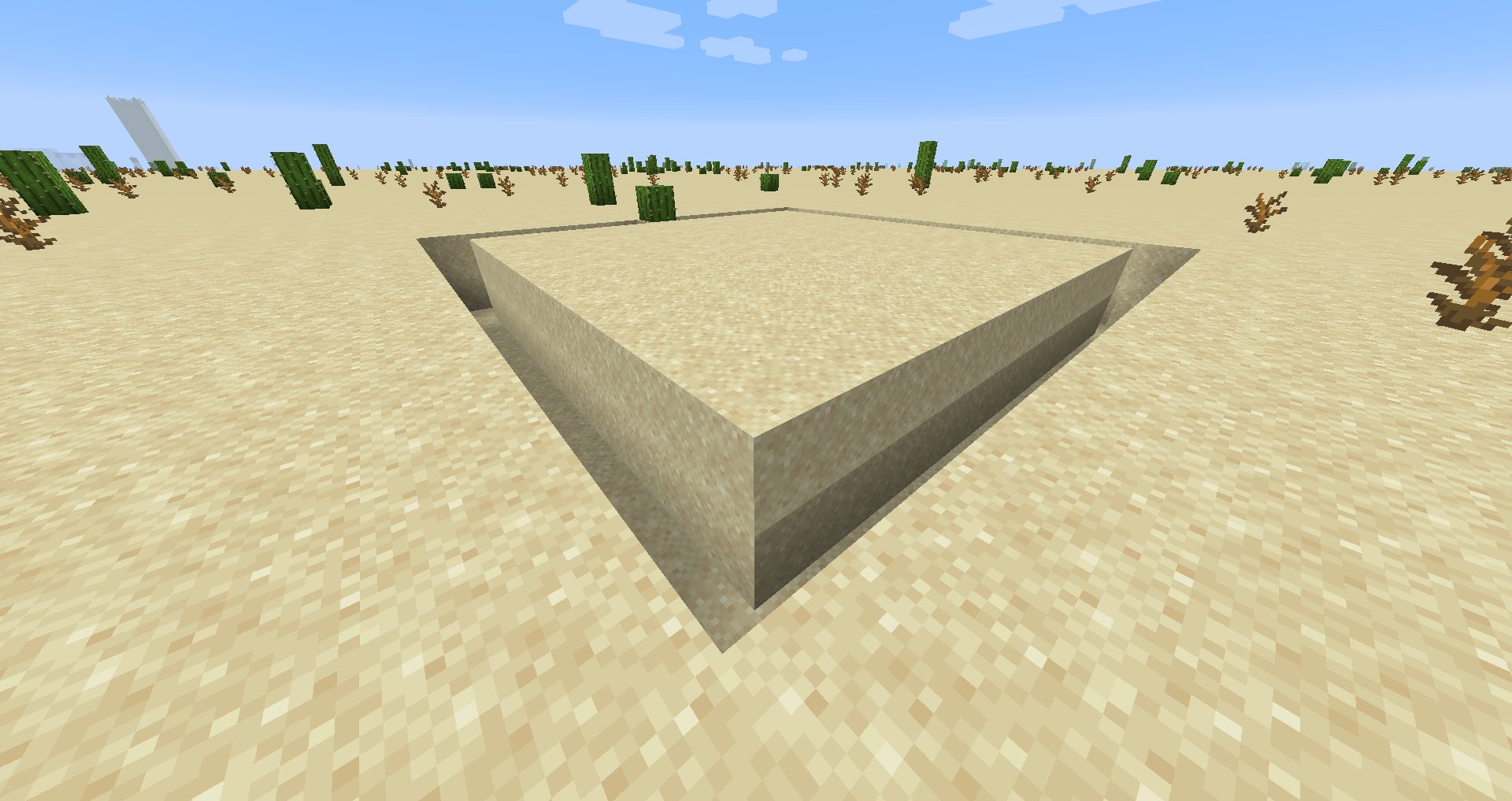 First lay out an 11x11 square by digging a 13x13 trench, 2 blocks deep. Dig the square one deep, then go back and dig it 2 deep. Start by putting down a marker, then dig one block at the marker, then dig 6 blocks in each direction from the marker. That's the first edge of your square. From the ends of that first trench dig up 12 blocks from each end. Check the lengths are both 13, then join the last side of the trench.