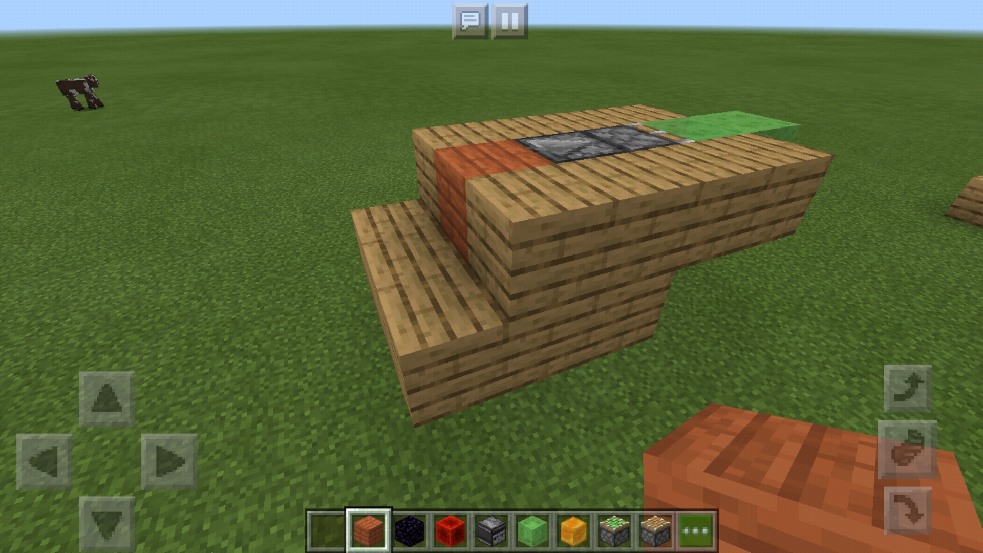 For players who want to ride their flying machine, it may be hard to add and remove the obsidian or redstone block (especially in survival mode). A slightly easier way is to add layers of another material (such as wood plank) to the machine, stopping just before the limit of what a piston can move and doubling as a practical gondola for the player at the same time. From a position sitting on the machine somewhere, the player may add another wood plank block to the machine, killing the speed. Removing the final block causes the machine to start again.