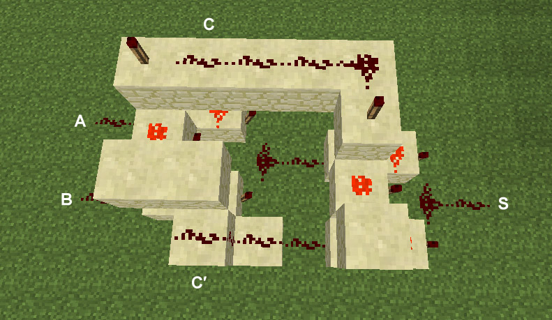 Extension: for those new to advanced redstone like myself, it's easier to understand it like this: let's say output B (C) has a NOT gate that inverts the signal and it leads to an iron door or piston door etc. Output A (S) is connected to sticky pistons controlling the floor. Let's say for sake of argument that there is 1×1×1 block NOT affected by the sticky pistons, this is the safety block. When you activate input A, both the door will open and the floor will drop, if you're standing on the safety block, then you will not fall. Input B will control only the floor, but if input A is on the input B will control them both. When both are on, input A will only affect the floor. This means if you are off the server and want no one in, leave A and B on, when they deactivate A, the floor will drop, but the door will stay closed, so if they know the secret, they still cannot get in.