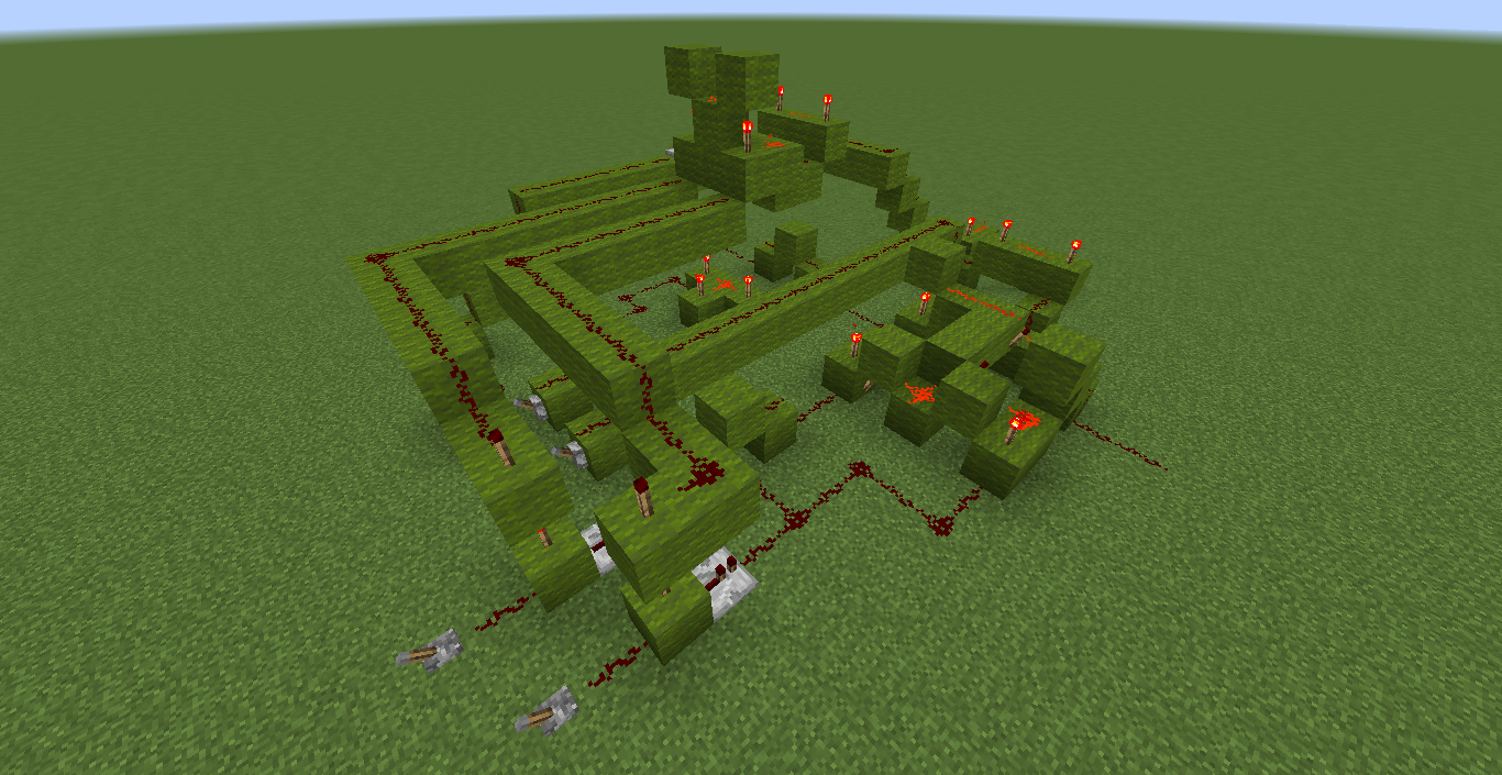 This is another example of a simplified version using Gray codes. The output appears at the torches at the end of the top rows. This design can be extended to any number of bits, but practical limitations due to timing considerations restrict the use of more than a byte or so. The outputs are triggered by the inputs 11, 01, 00, 10, respectively.