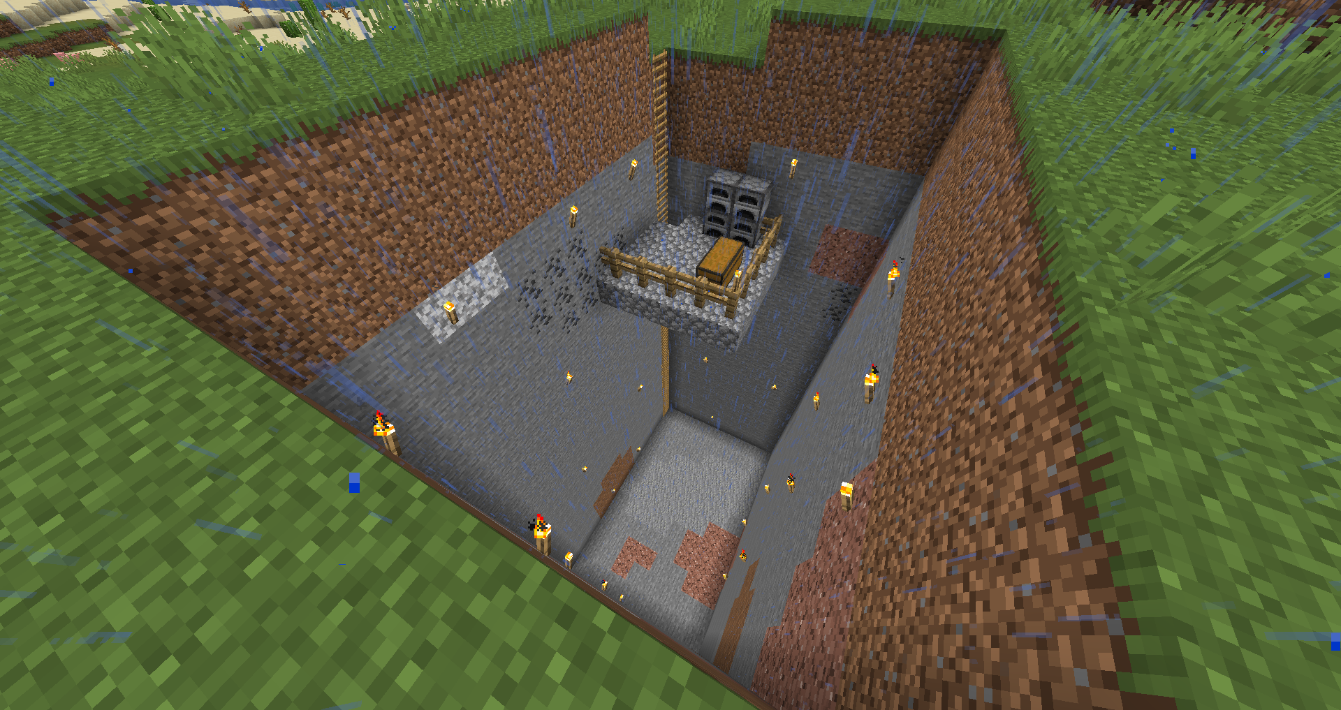 This is similar to the 3x3, except that you dig out the edge of a 5 by 5 grid. The center column is cleared, acting as a supply of light on the way down. The middle acts as a safety barrier, and the outer ring has the staircase itself. The middle can also be hollowed (digging straight down should be safe so long as you didn't find any caves or lava pools as you made the staircase) out and a ladder or waterfall can be placed in it, with openings at different levels to allow for quick and easy access. Note that climbing ladders does not deplete hunger, unlike walking and jumping used to travel the outer ring. Swimming does deplete hunger, but since you have less distance to travel, you still come out ahead.
