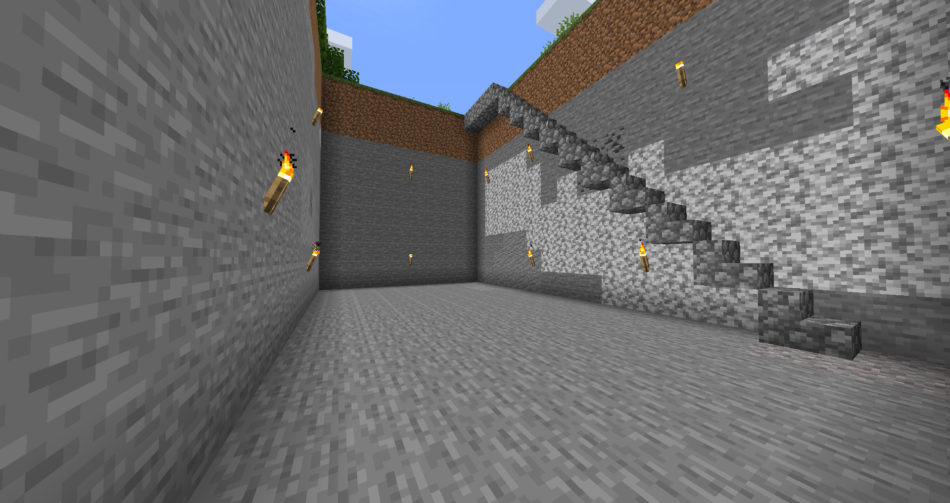 A straight staircase heads down, but also over. This may or may not be useful—with a map, you might learn about more of the surface you're going under, but if you need to dig your way back up a different way, you may come out in unknown territory. Also, a long staircase from your base may take you out of chunk-update range from your base, or at least far enough out that further exploration will take you out of range. Then your crops won't grow and so forth while you're mining. All of these can be 1, 2, or even 3 blocks wide.