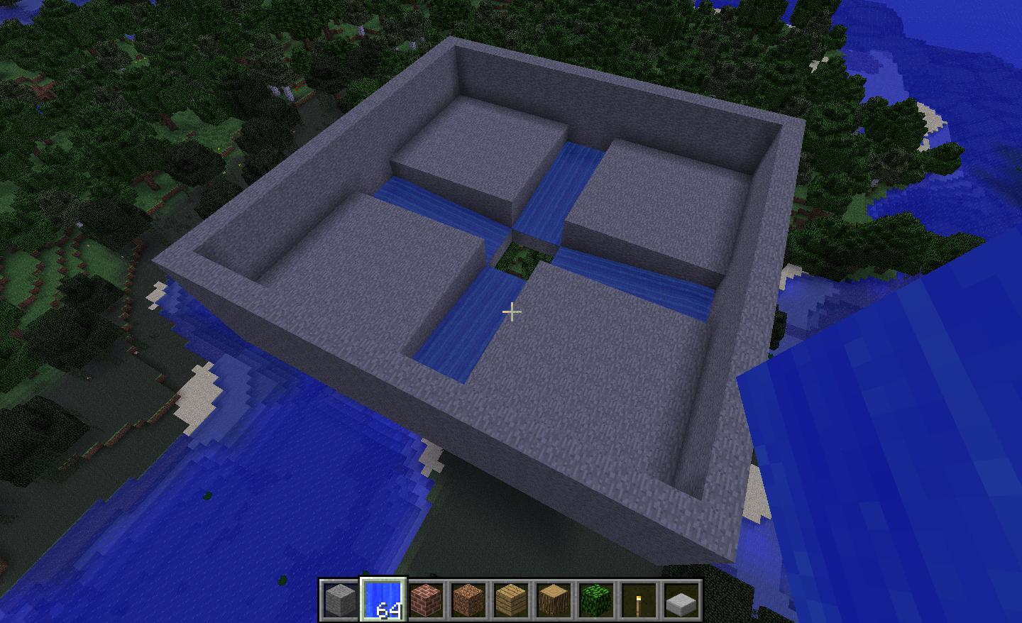 If there is not enough space for larger designs, this might be used. Its small size of 10x10 (inner area) makes it able to be incorporated into larger construction projects without trouble. It uses four water source blocks, one in each corner, with the water flowing around 3x3 squares of building material to the central hole. The parts of the water between the wall and the blocks is closed over to provide more spawning area.