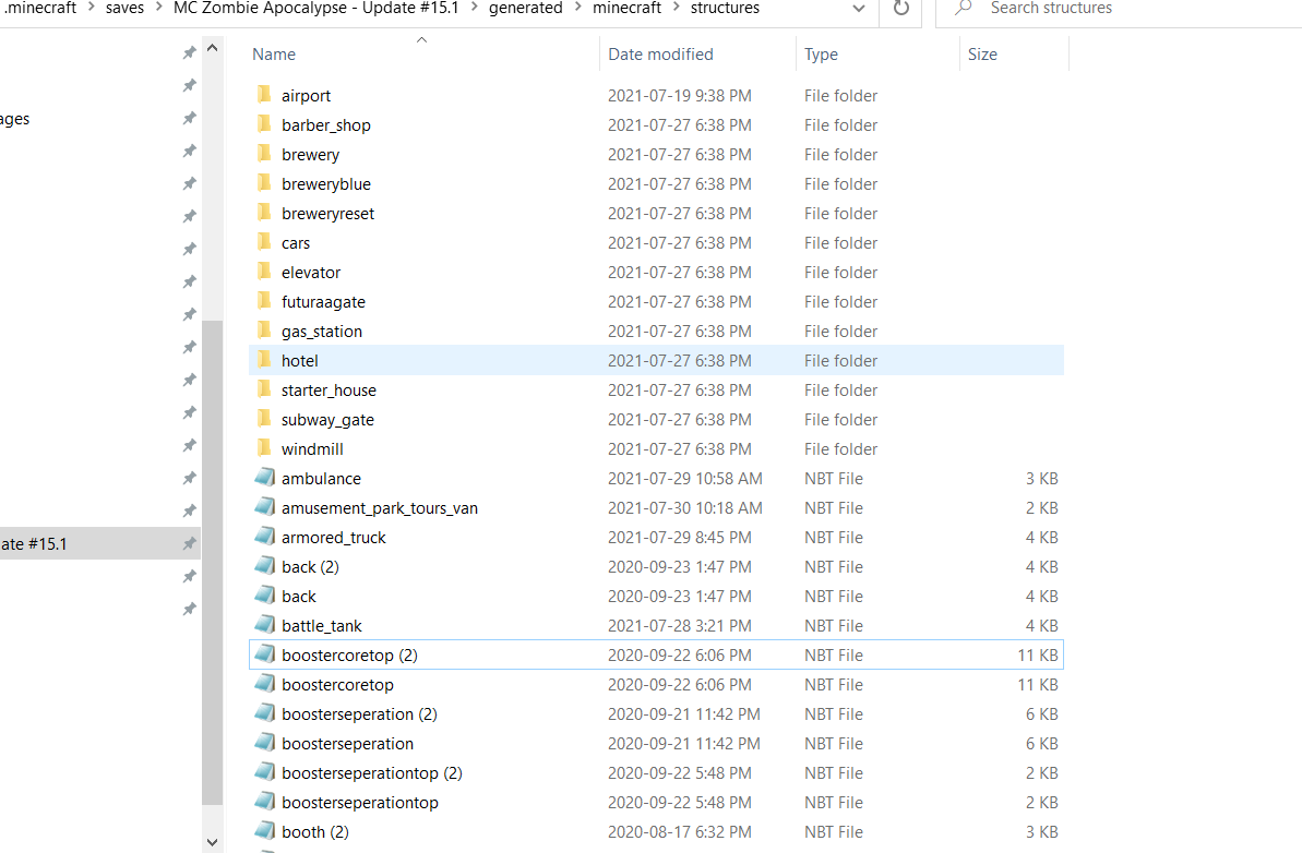 Click on that "generated" folder, and open the next couple of folders inside the "generated" folder ("minecraft" and "structures") until you find yourself in the "structures" folder, where all of your structures from that world are stored in NBT files.