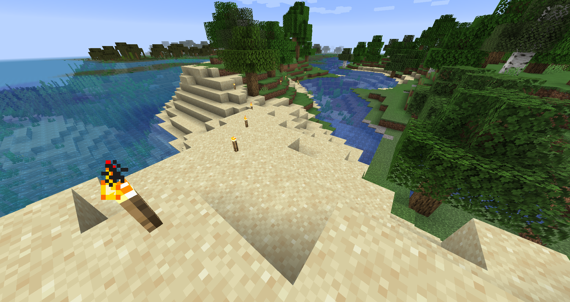 - Pillars: Visible at a distance, can be made of snow, sand, stone, dirt, or other brightly-colored or reflective blocks, then lined with torches or capped with lava or burning netherrack. A quick way to make a tall pillar is to clean the leaves off one or more trees in the area of the landmark or perhaps along a route. No tools are required, and clearing the foliage can help to uncover the landmarks and create paths.