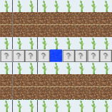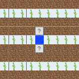 Most of the above farms can be tiled to make larger farms, though in some cases, alternate rows or columns of the plots should be flipped for best results. This farm represents an expansion of design A (turned sideways), with the left column of plots reversed (it also shows the farmland border for the whole farm). The basic plots could be repeated further, expanding the farm in units of 9×9. Note that this design aims to make sure that each fruit occupies only one stem — as it increases in size, the efficiency approaches 49%.
