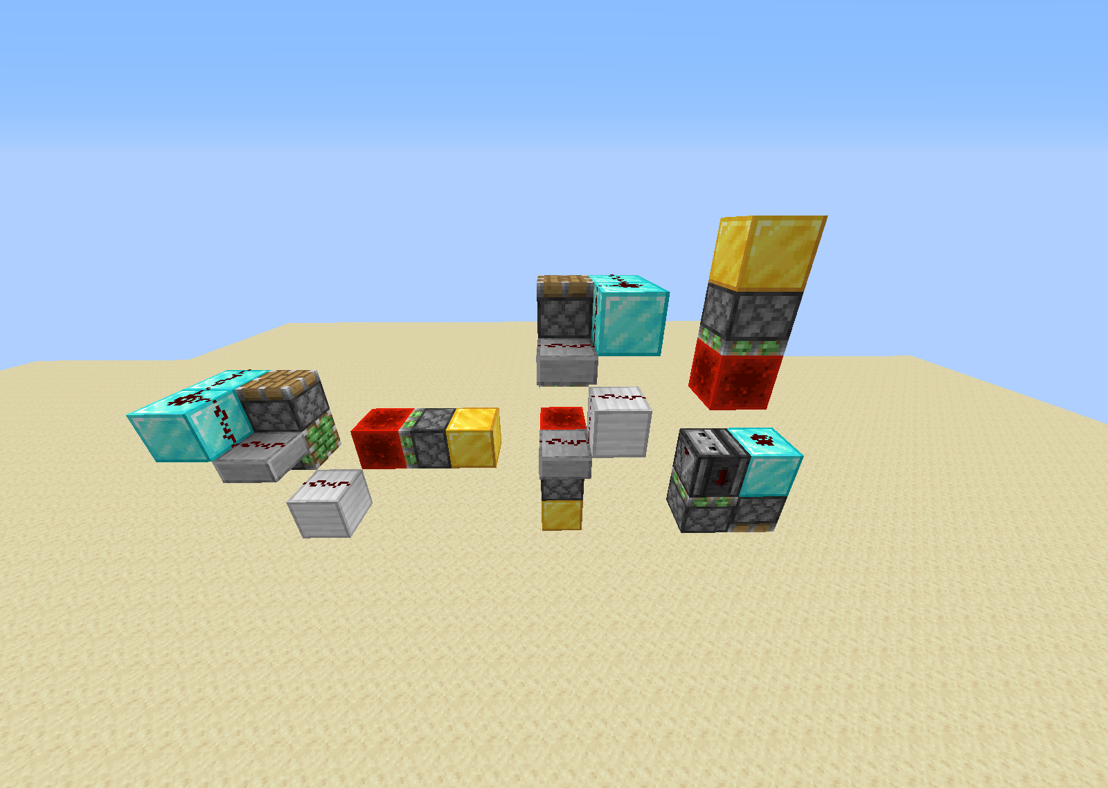 One method of 0-tick chaining is to utilize the fact that tileticks such as repeaters and comparators will process in a tick before block events such as piston extensions and retractions. In the shown example, when the input is powered, the quartz block will be 0-ticked by both pistons causing it to instantly move two blocks, ending up above the diamond block. The 0-tick generator to the right makes use of tileticks and will activate before the 0-tick generator on the left, which uses block events. This method of chaining is very compact, but it comes at a downside that this method can only be used once per chain.