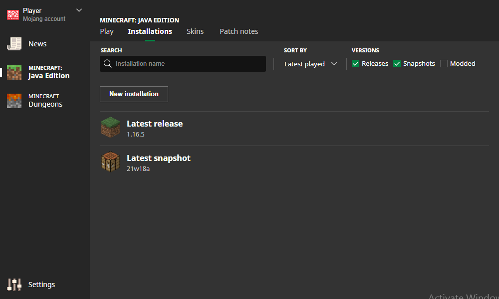 In the "Installations" section, the player can create and edit custom installations of the game. There are buttons to sort and search installations, as well as tick boxes to enable installations with "Releases", "Snapshot", and "Modded" versions of the game. Installations are stored in launcher_profiles.json in the game's directory (.minecraft).
