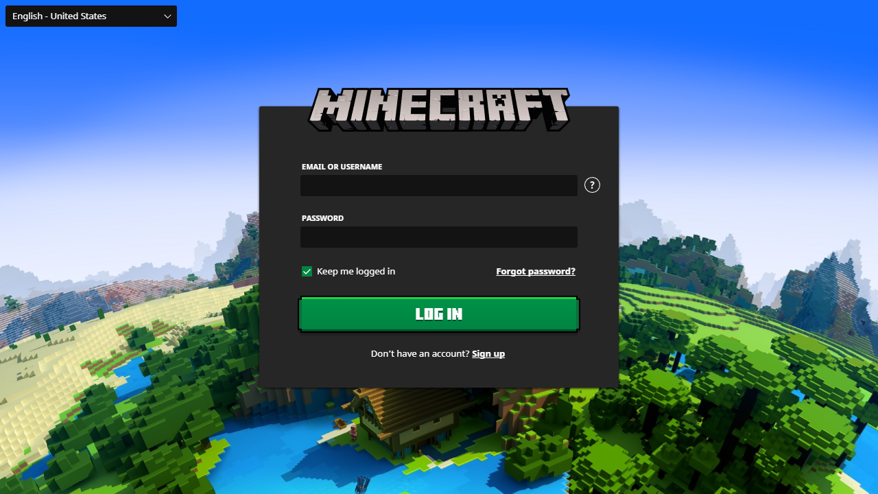 On the initial login screen, the player must log in with a pre-existing Microsoft account, Mojang Studios account, or legacy Minecraft account, otherwise they can create a new Microsoft account by clicking the link.