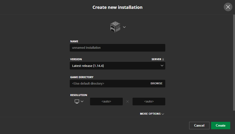 By default, there are installations for the "Latest release" and for "Latest snapshot" (if snapshot are enabled), both of which the game versions cannot be changed. The player can create a new installation by clicking the "New installation" button and can edit clicking on the installation. There is a play button which launches the selected installation, as well as a folder icon that takes you to the installation's game directory. The ellipses button contains the options to edit, duplicate, or delete an installation.