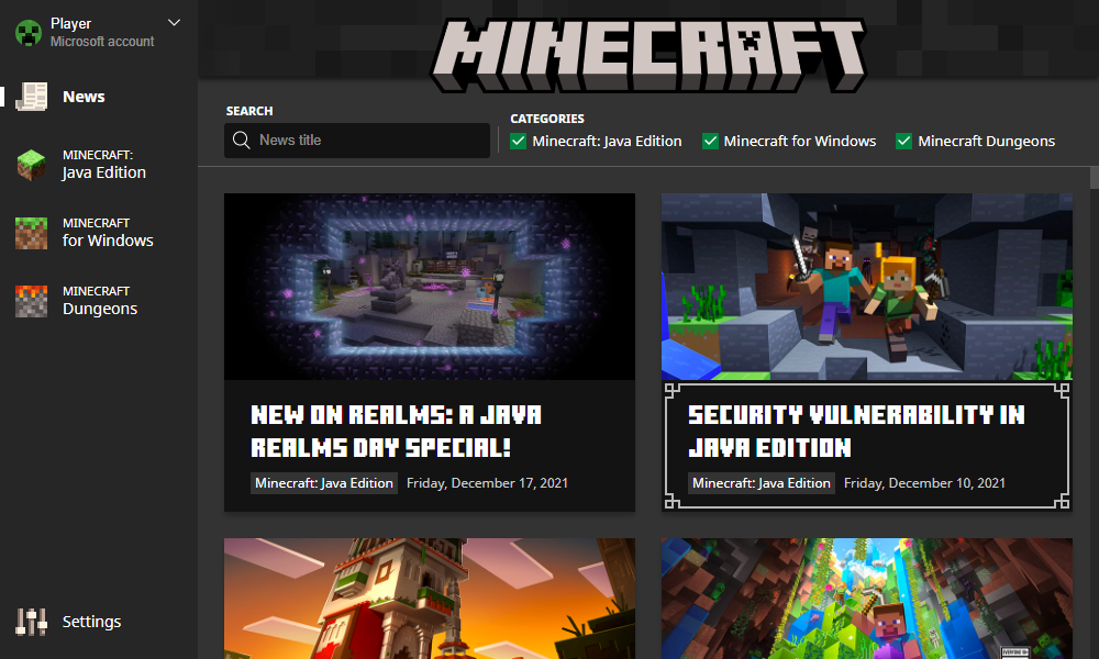 Once logged in, the launcher has a "News" tab which shows the latest news from minecraft.net, a tab for each game, and the launcher "Settings" tab.