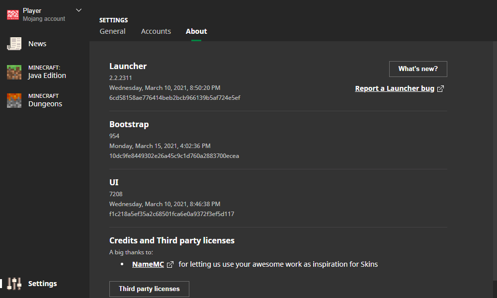 The "About" section contains details about the launcher including its version, credits, and third-party licences, as well as a list of patch notes by clicking the "What's New?" button.