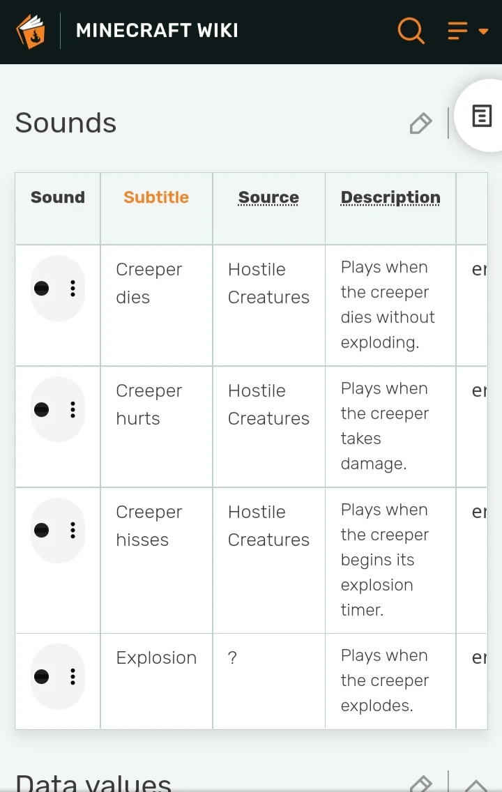 - I never use mobile devices for wiki work but I just tried accessing the creeper article. The sound icons are being compressed into a drop-down menu, which is correct behavior for small displays. However, when I tap on the menu item, it opens into a blank list. I can still tap blank rows in the list and hear sounds, but there are no icons. The best approach is to report it at Minecraft Wiki talk:Community portal. And include more detail. Amatulic (talk) 13:33, 5 July 2021 (UTC)