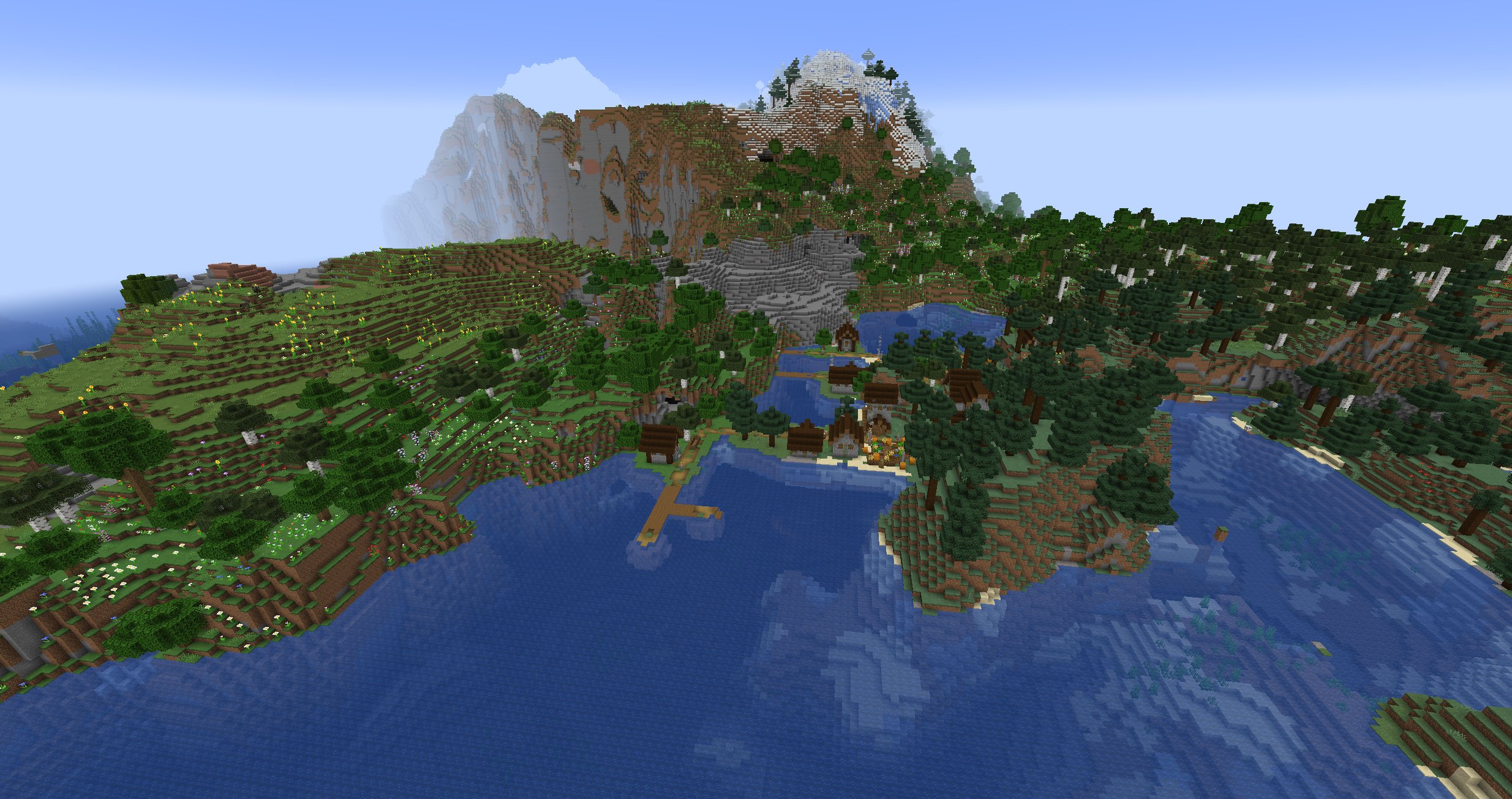 A village generated in 5 biomes: Forest, Plains, Cherry Grove, Frozen Peaks, and Grove. There is also a ruined portal nearby, visible in the next image.