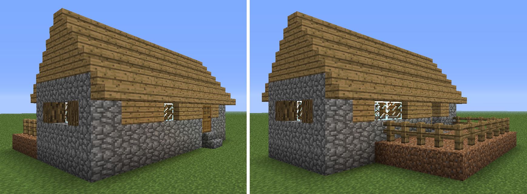 | Small House | Small Houses are similar in size to wood huts, but made with more planks, fewer wood blocks, and a cobblestone floor. Their roof is flat, and may have fenced off balcony with access provided by ladders. As with wood huts, they generate with no more than one villager. Unlike most other buildings, small houses have no door. As they have no door, they do not count as homes for villagers. | |
