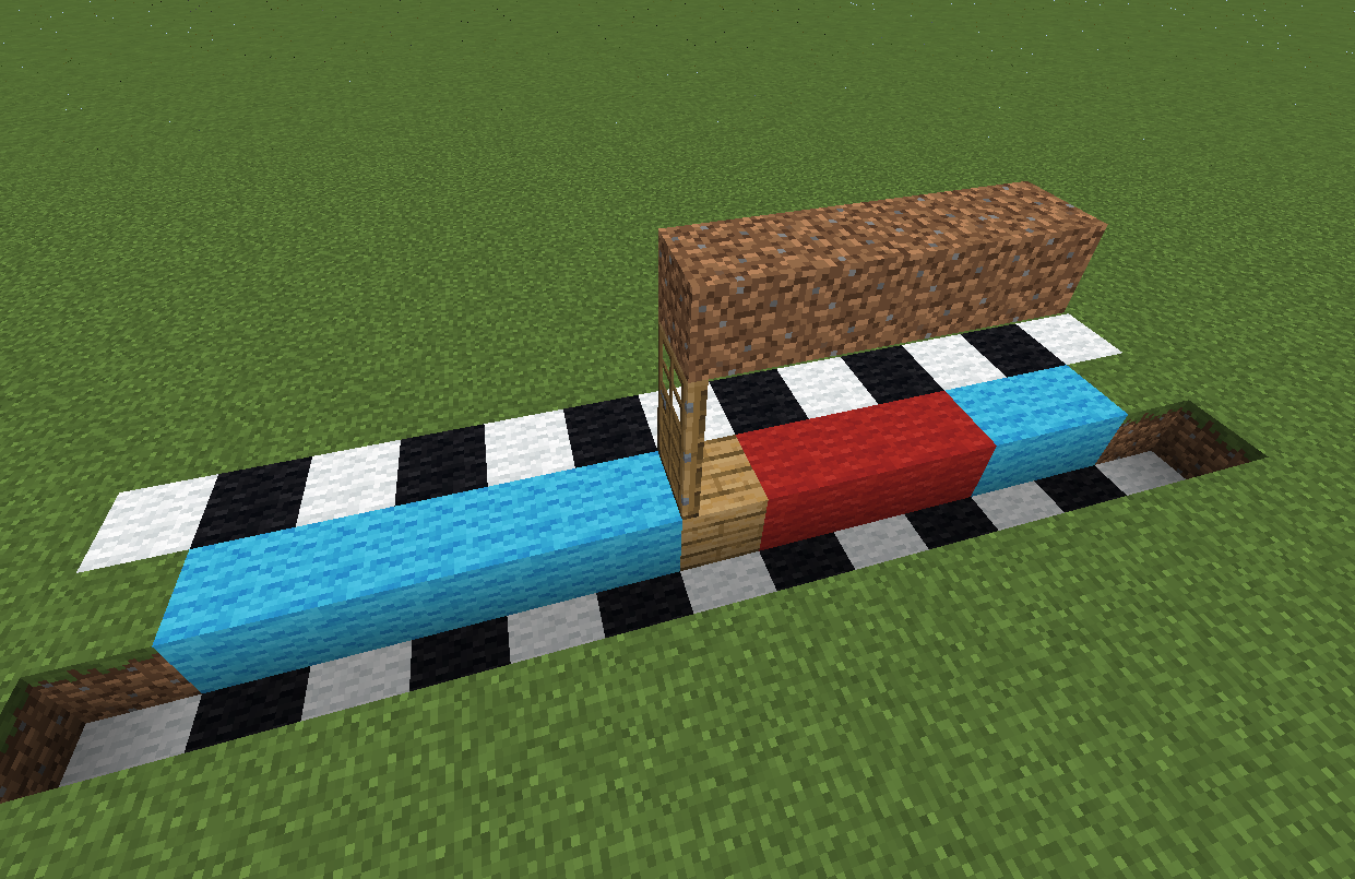 Farm: Farms can come in small and large varieties. All consist of plots separated by rows of water, surrounded by wood logs or sandstone. The small farms contain two 7×2 plots of crops (wheat, potatoes or carrots), separated by a row of water. Larger farms are essentially two small farms combined side-by-side, with a walkway down the middle in lieu of a third water row.