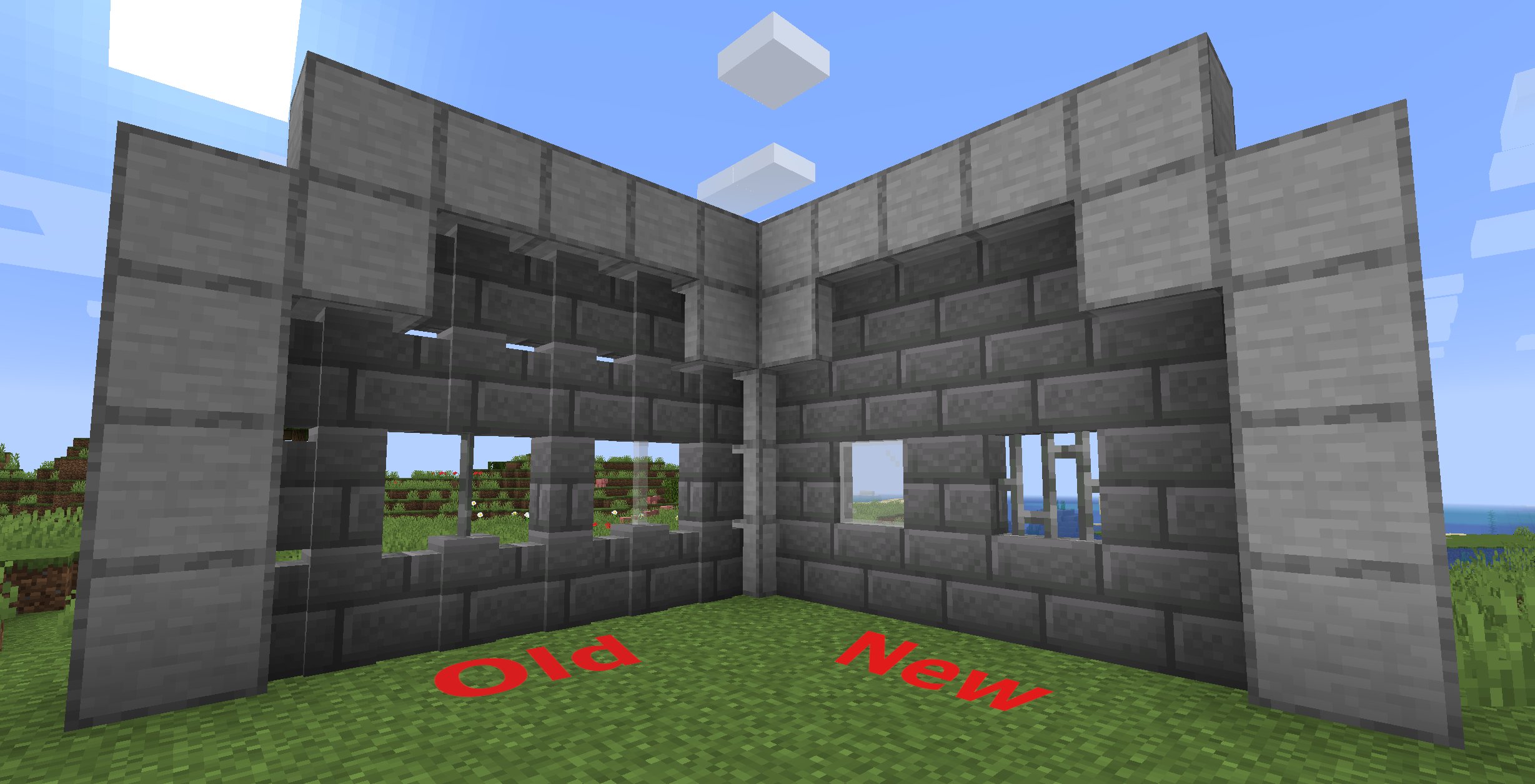 Walls connect to other walls to create a large, flat wall. They also connect horizontally to iron bars and glass panes. However, they do not connect to fences (fence gates can be connected though).[1]