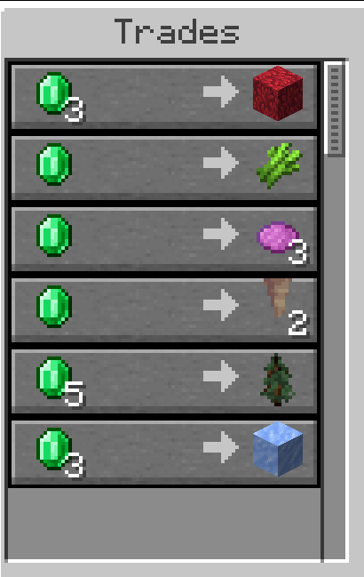 Wandering traders typically sell items generated in the world or otherwise related to nature, such as plants, dyes, and buckets of fish. They can also trade less common items, such as coral blocks, blue ice, or nautilus shells. Overall, trades offered by wandering traders offer a way to obtain biome-specific materials, without having to travel to the specific biomes.
