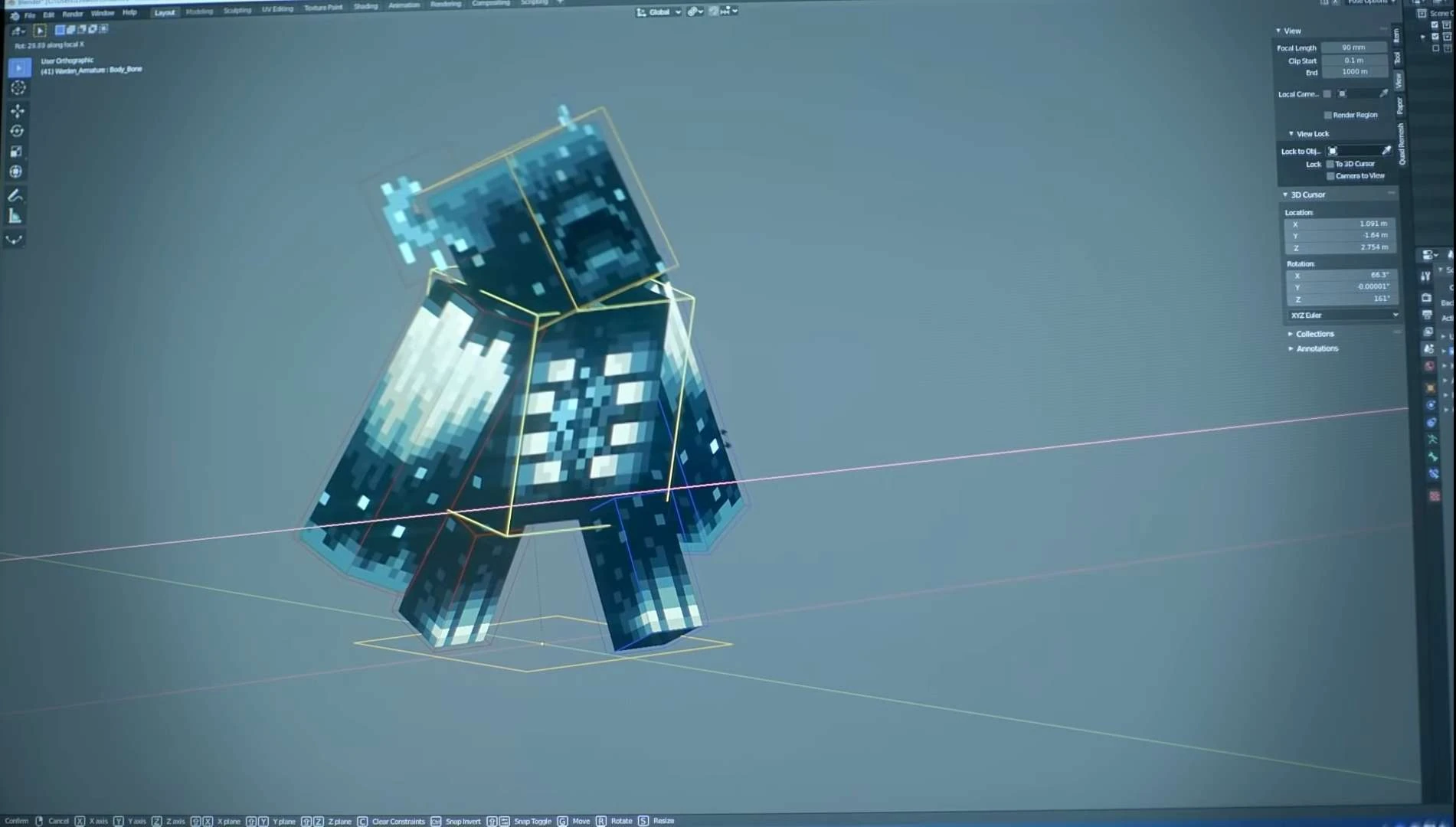 A warden with a bow tie, wooden cane and glowing sticks dancing from Minecraft's YouTube.