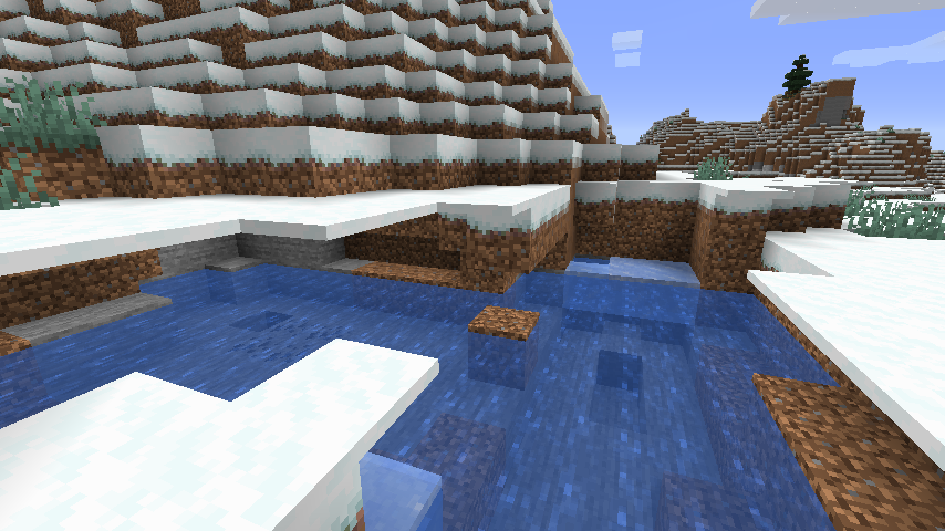 Water lakes, which were bodies of water source blocks, could generate at any altitude. They could generate underground connected to caves, or isolated, connected to no other structures whatsoever. When in a snowy biome, these small lakes were never initially frozen but turned to ice if exposed to the sky.