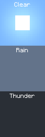 Players who have cheats enabled can change the current weather if they wish, by entering the commands: /weather clear [<duration>], /weather rain [<duration>], or /weather thunder [<duration>] Note that <time> is the number of seconds that the weather will take place.