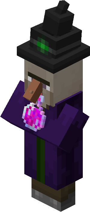 A witch is an uncommon hostile mob that uses harmful splash potions as ranged weapons and beneficial positive potions on itself. They spawn in the darkness, in swamp huts, during raids and when lightning strikes villagers. Despite having big noses and taller heads, the witch is neither considered an illager nor a villager.