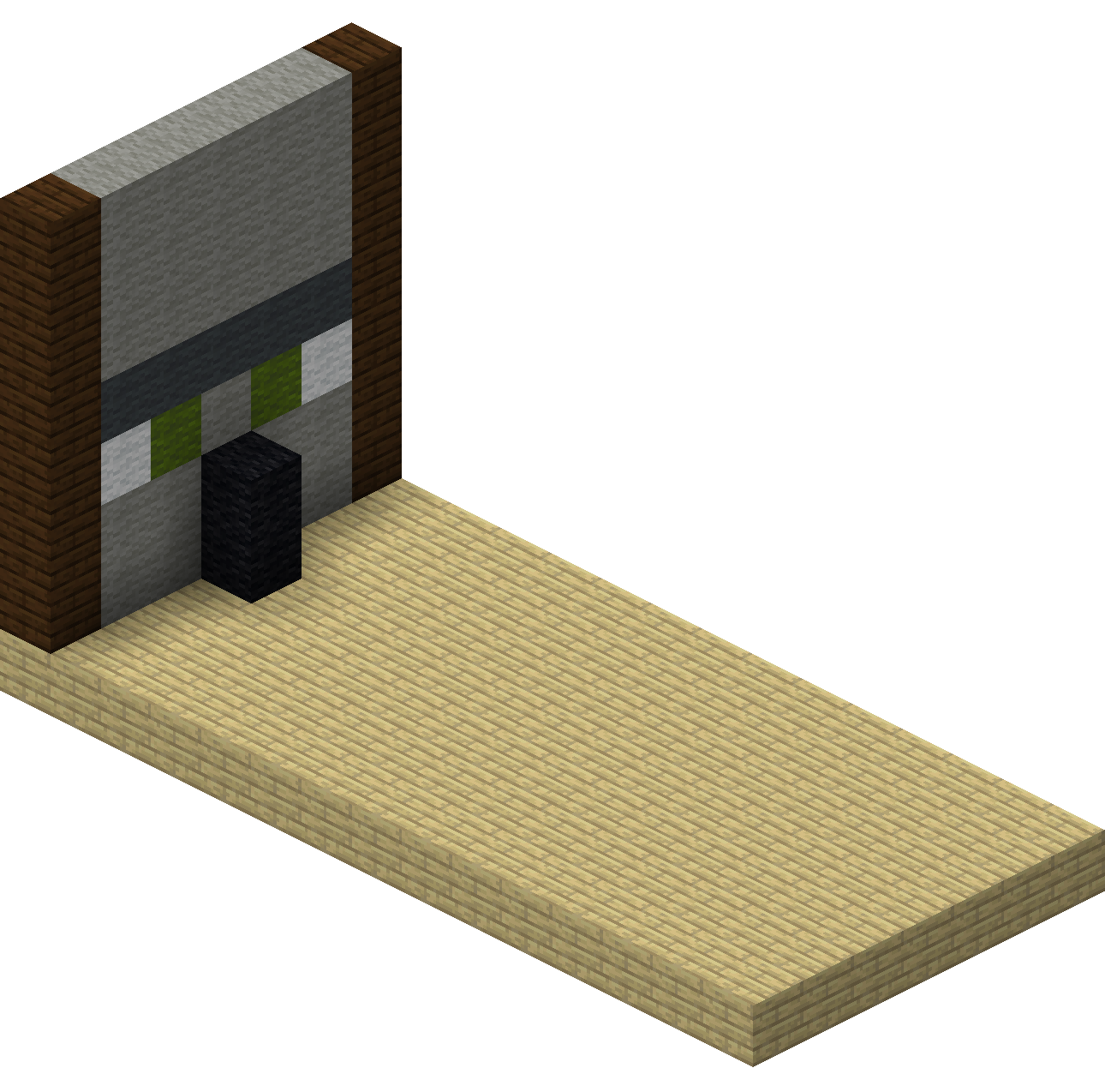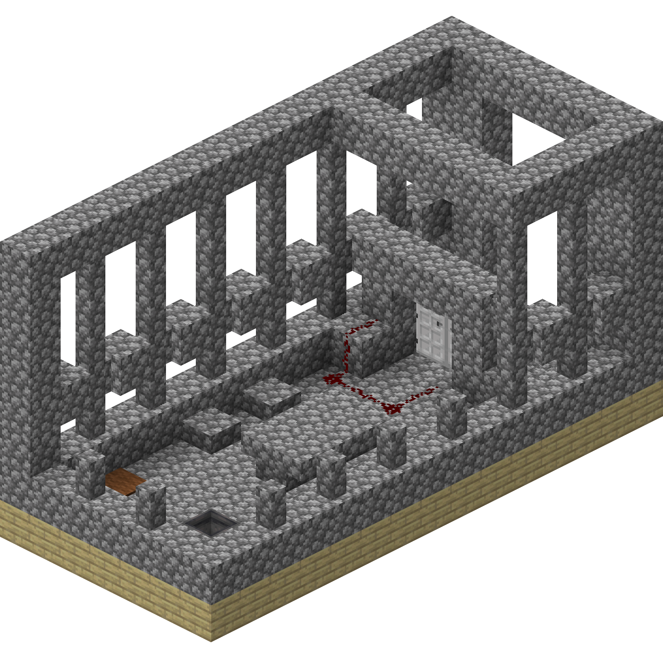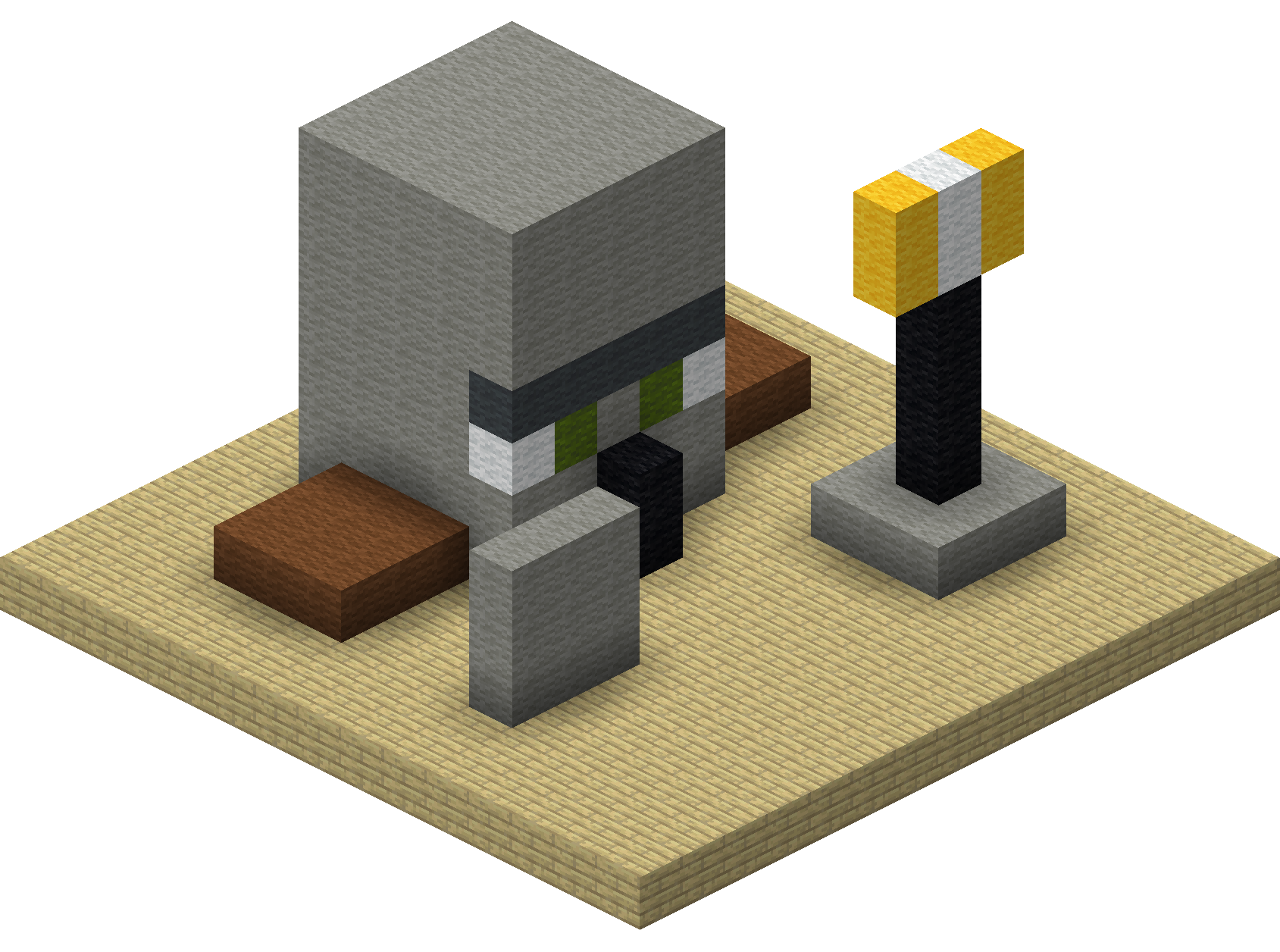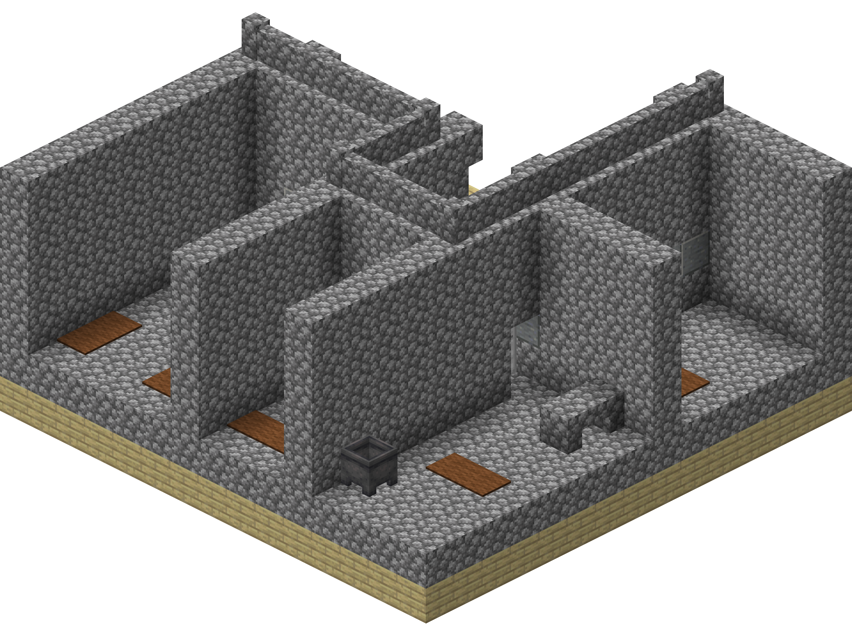 A room with a large cobblestone jail accessible through a lever-connected redstone circuit that opens the jail’s two iron doors. Inside the jail is a small table constructed with cobblestone stairs, some brown carpets and a cauldron. A vindicator always generates here. |