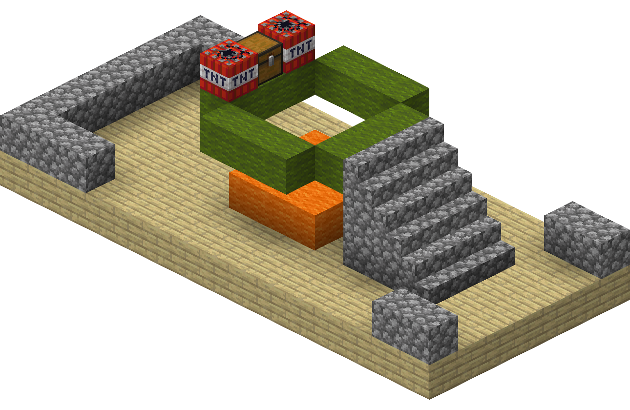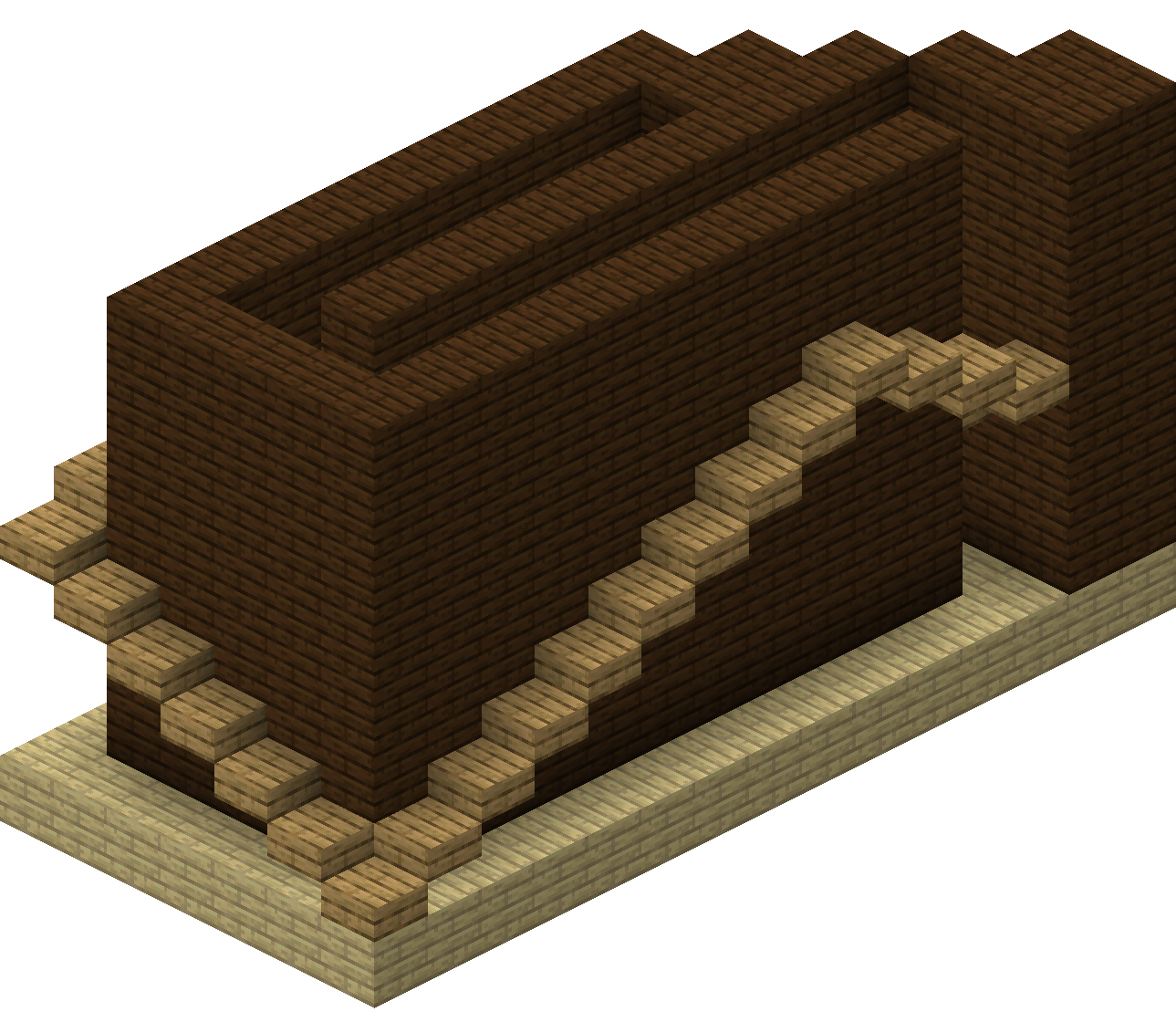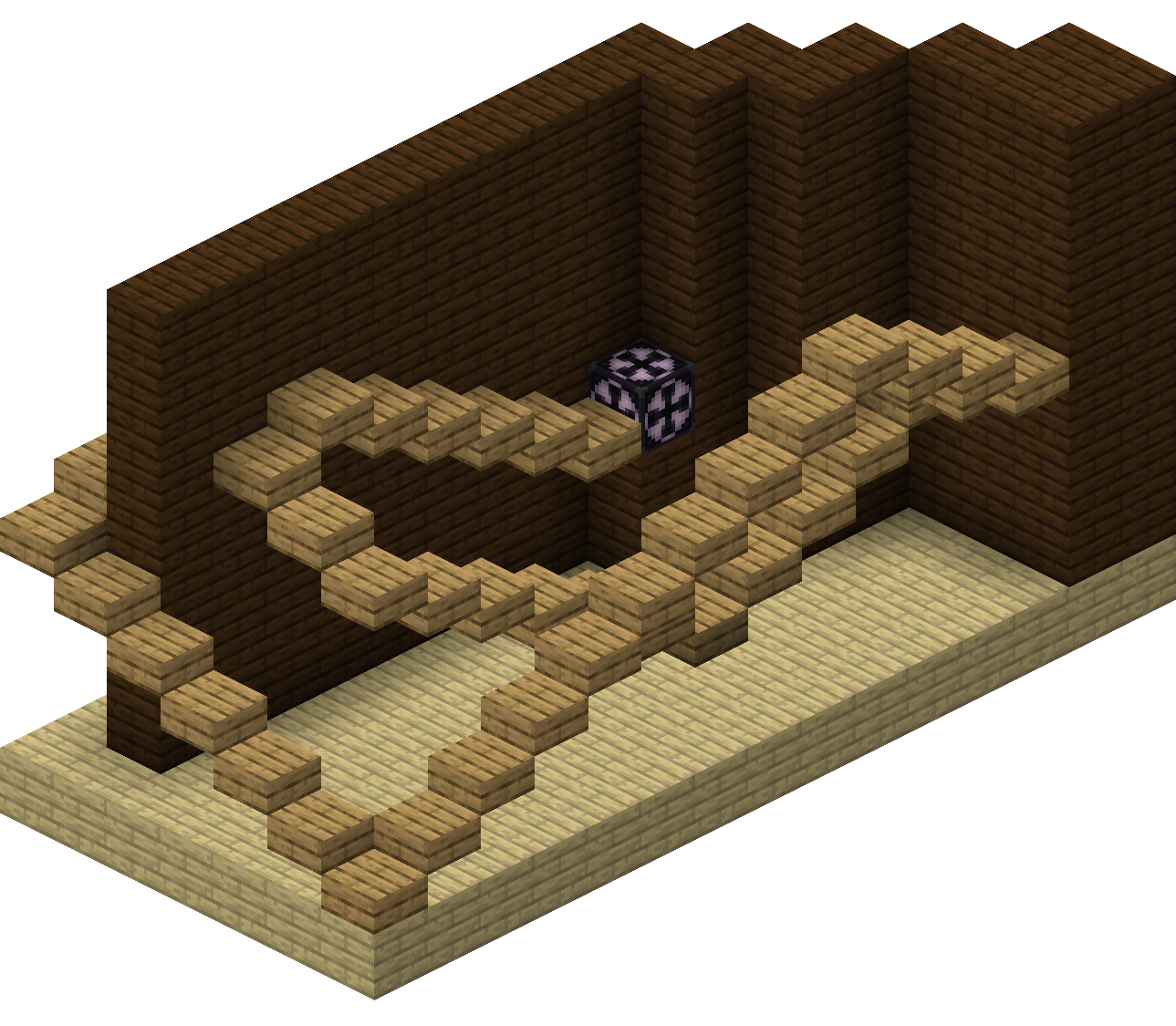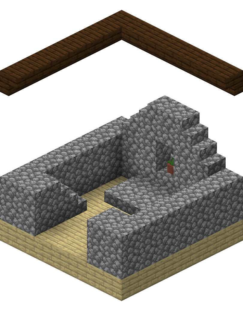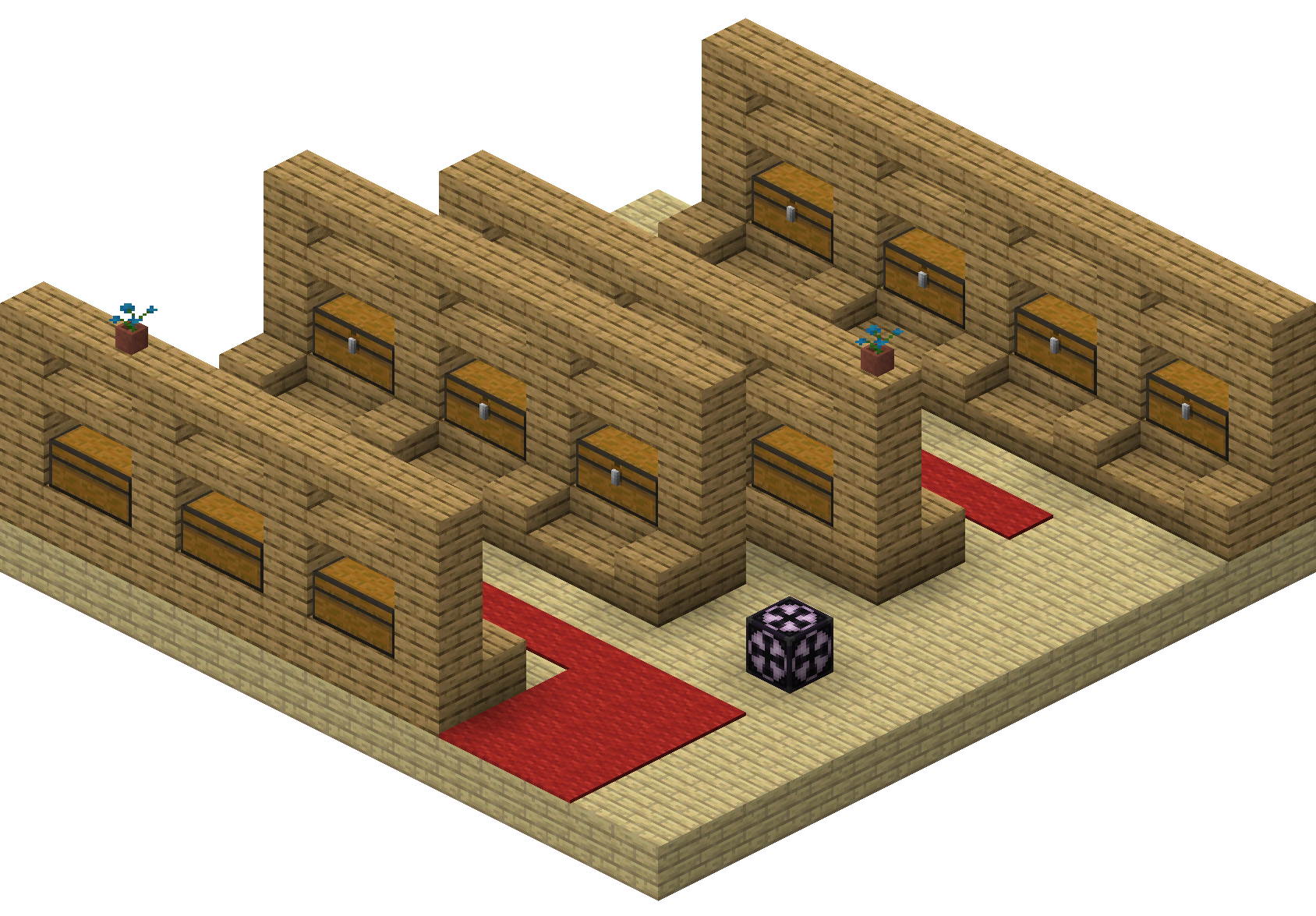 A room containing an artificial tree on a dirt platform and a chest that always holds an iron axe with Efficiency I[Java Edition only]. This room’s entrance is sealed off by a wall of dark oak planks. |