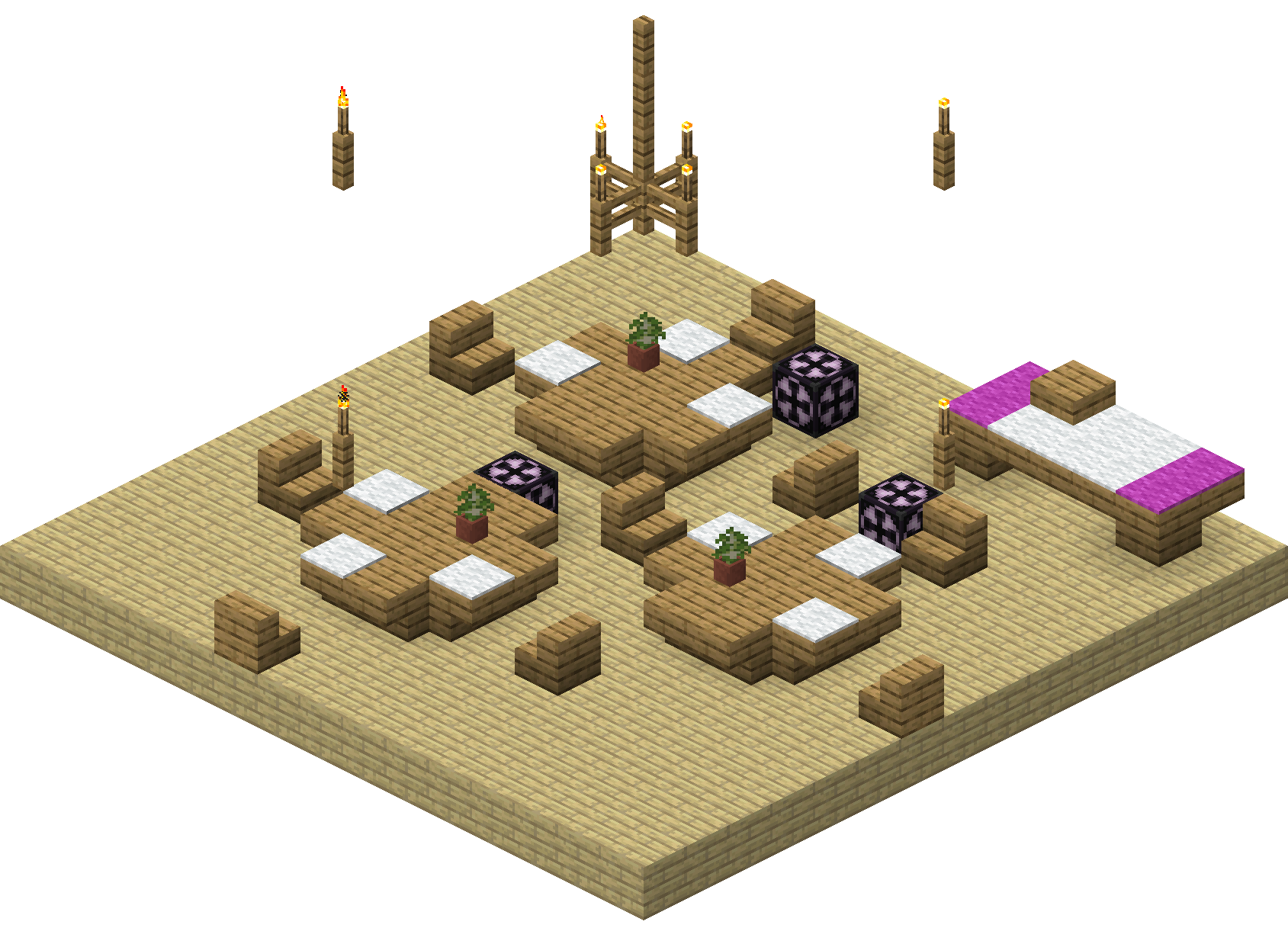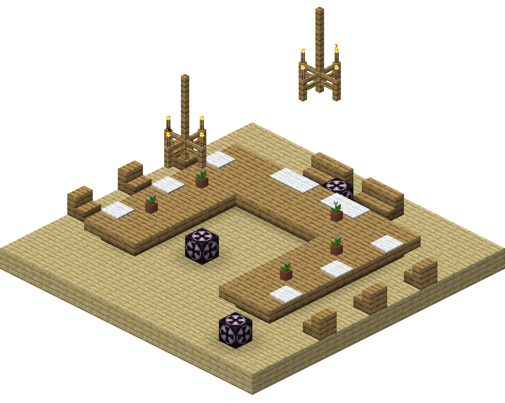 A room with a carpeted table accompanied by chairs made using dark oak stairs. The upper parts of the walls are decorated with chimney-like structures. |