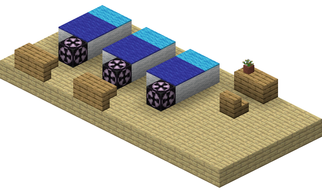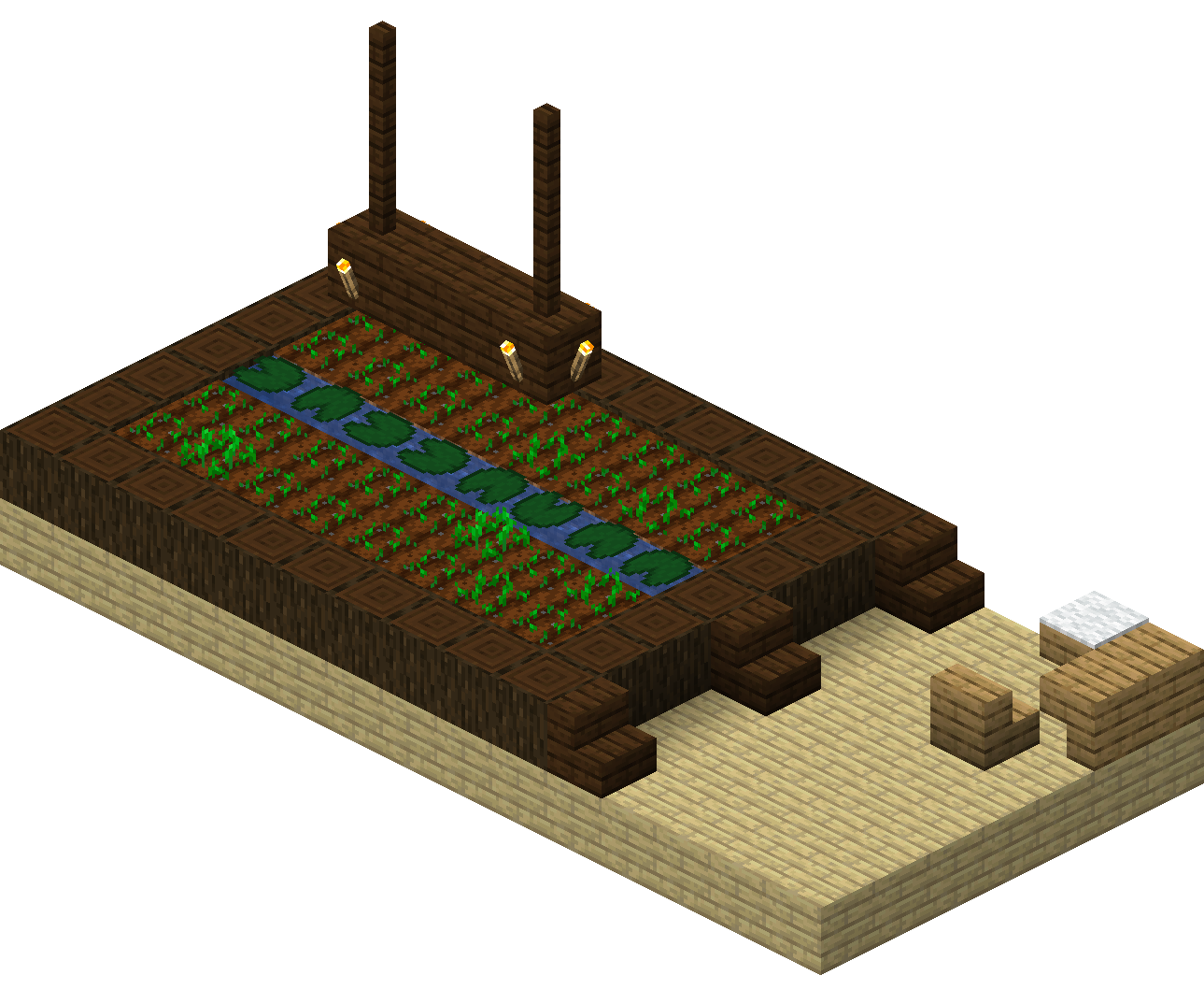 A room with a wheat farm and a small table with a chair in the corner. The water in the farm is covered with lily pads. Some, or even all of the crops may be missing. The farm resembles a farm found in a village, but uses dark oak logs instead. |
