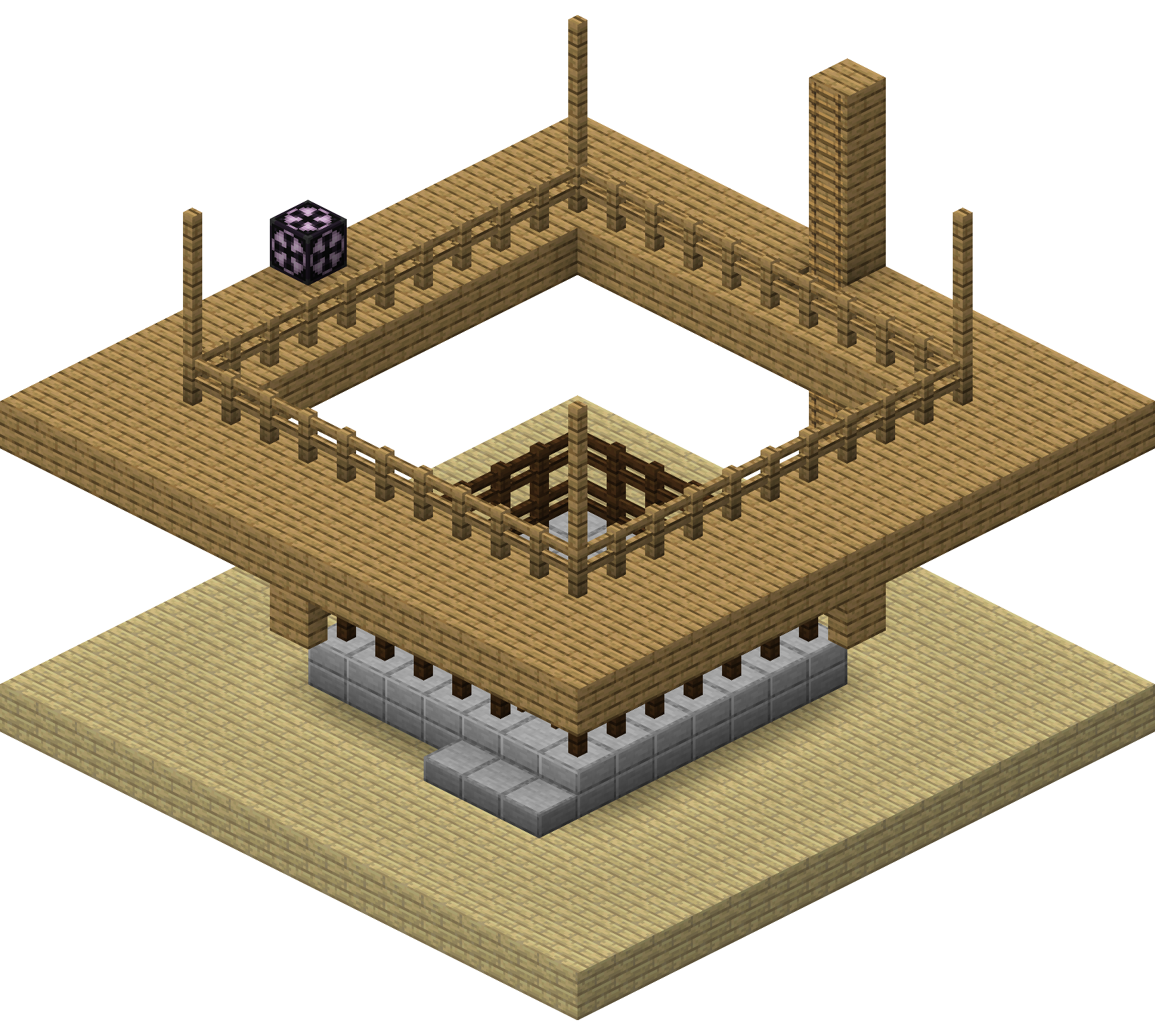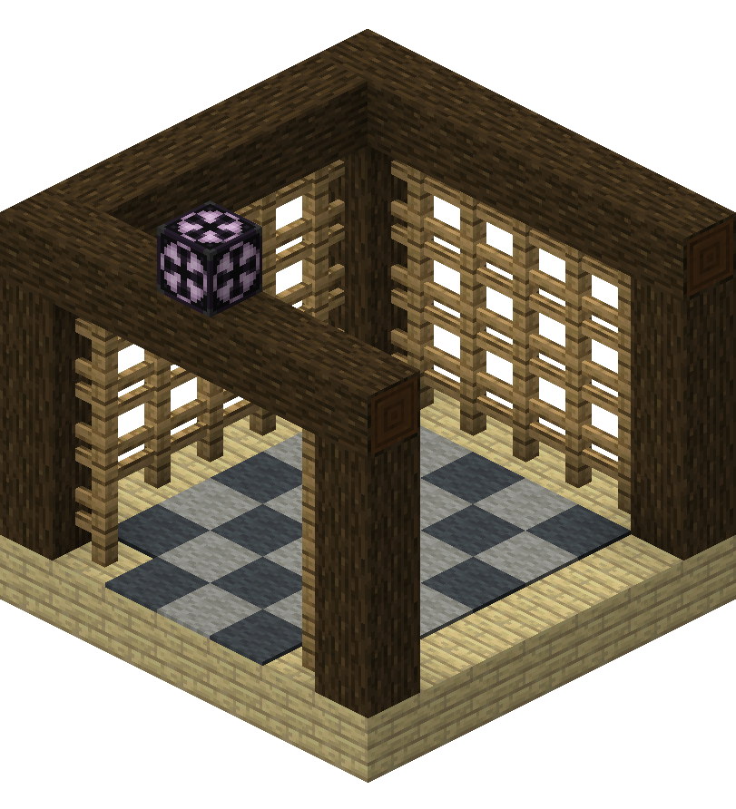 A room with a checkerboard pattern on the floor, slightly resembling that of a kitchen, and all the walls are lined with oak fences. A loot chest lies hidden above the door. |