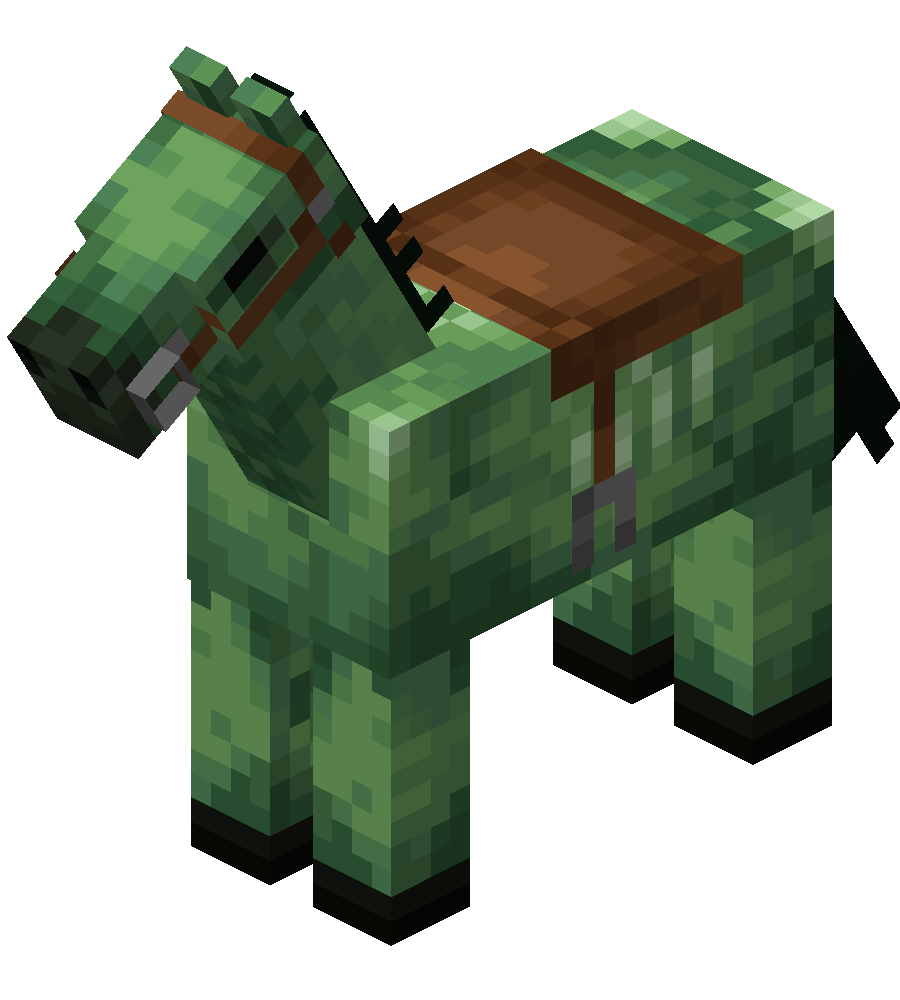 The zombie horse is an undead mob that is completely passive. Zombie horses behave like normal horses, roaming idly and occasionally stopping to rear, swish their tails, or lower their heads as though eating the grass. Unlike sheep, the eating animation does not actually cause any grass to be consumed. Zombie horses can breathe in water.