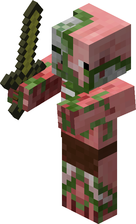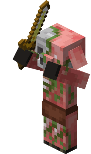 A zombified piglin is a neutral undead variant of the piglin that inhabits the Nether. Zombified piglins normally ignore players, but if one is attacked, it and all zombified piglins in the vicinity become enraged and attack the aggressor with their golden swords.